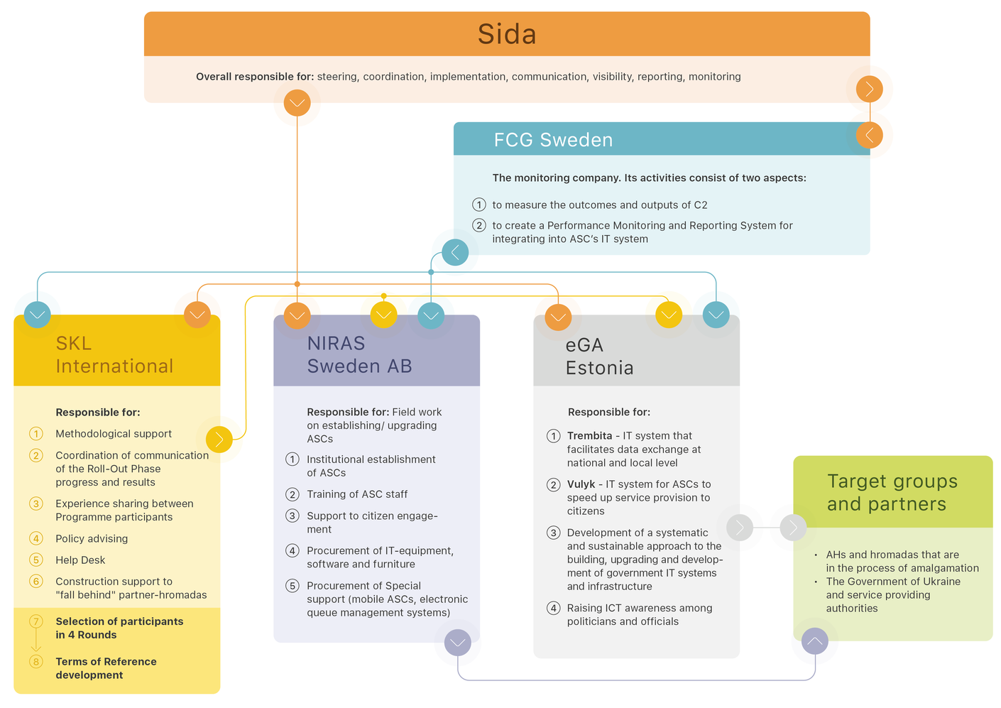 - Sida selects Implementers within the framework agreement. The partner Hromadas and the Implementers start their cooperation by signing agreements that regulate the terms and timelines, based on the ToRs and the Declarations of Intent