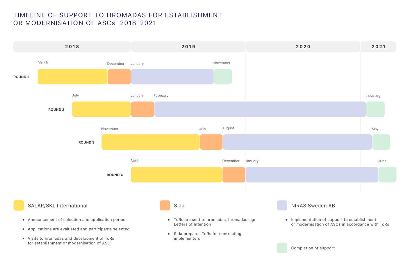 - Institutional support: establishment of the ASCs institutional structure, staff training, raising awareness and citizen participation; study visits and experience sharing