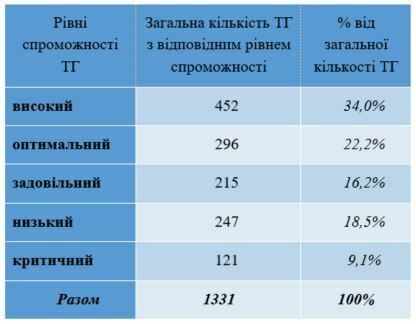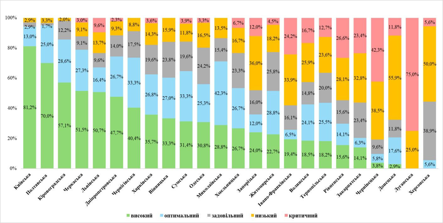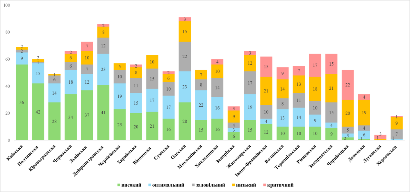 До задовільного рівня віднесено 215 територіальних громад (16,2%), у тому числі: в Одеській області – 22, Житомирській – 17, Вінницькій та Закарпатській – по 15.