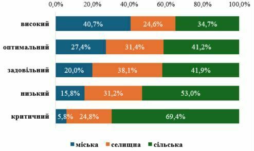 Результати аналізу засвідчили продовження тенденції залежності між сформованими рівнями спроможності територіальних громад і категоріями населених пунктів. Так, відповідно до проведеного оцінювання, із 452 громад, що належать до високого рівня спроможності 184 (або 40,7%) мають статус міських, 111 (24,6%) – селищні громади, 157 (34,7%) – сільські громади. По мірі зниження категорії рівня спроможності (від високого до критичного) частка територіальних громад міського типу зменшується, водночас частка сільських громад зростає: серед 121 громади, які віднесені до критичного рівня лише 7 (5,8%) міські громади, 30 (24,8%) – селищні, 84 (69,4%) – сільські громади.