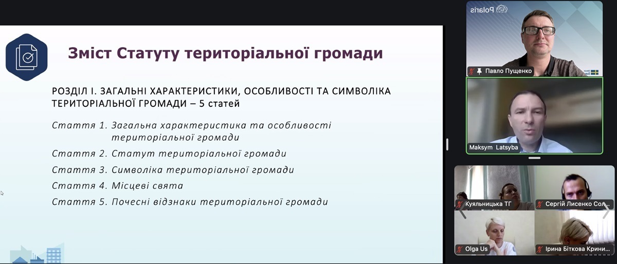 Павло Пущенко, експерт Програми Polaris, представив покрокову дорожню карту розробки індивідуальних проєктів статутів для кожної громади. До кінця липня громади мають: