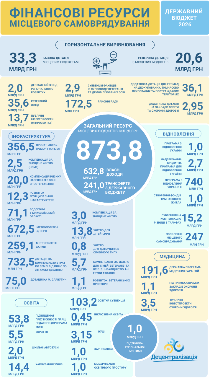 The Draft State Budget of Ukraine for 2026 prioritises financing social programmes, housing renovation, the modernisation of educational facilities, support for veterans and the implementation of state investment projects. In preparation for the analysis of the Draft State Budget of Ukraine for 2026, together with Ihor Onyshchuk, an expert from the Swedish-Ukrainian Polaris programme ‘Support for Multi-Level Governance in Ukraine’, we have created an infographic summarising the key indicators and areas of state support for local communities. The infographic is designed to clearly demonstrate the main volumes of financial resources provided for in the draft budget, as well as their impact on the development and restoration of local self-government.