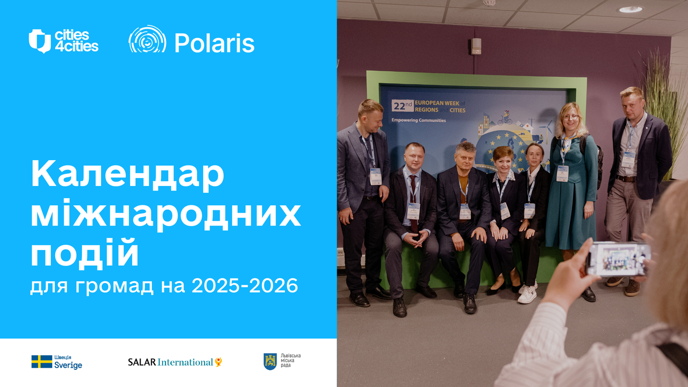 Для українських громад найближчий рік, осінь 2025 - літо 2026, відкривають чимало можливостей для прямого діалогу з європейськими та світовими муніципалітетами, навчання, пошуку фінансування й налагодження стійких горизонтальних зв’язків. У цій статті Cities4Cities, яка впроваджує напрям «Міжнародна муніципальна співпраця» Програми Polaris «Підтримка багаторівневого врядування в Україні» зібрала ключові міжнародні події, які варто взяти до уваги громадам і вже планувати свою міжнародну активність. Також дивіться тематичний випуск “П’ятниця з Cities4Cities”, яку ми впроваджуємо в рамках Програми Polaris.