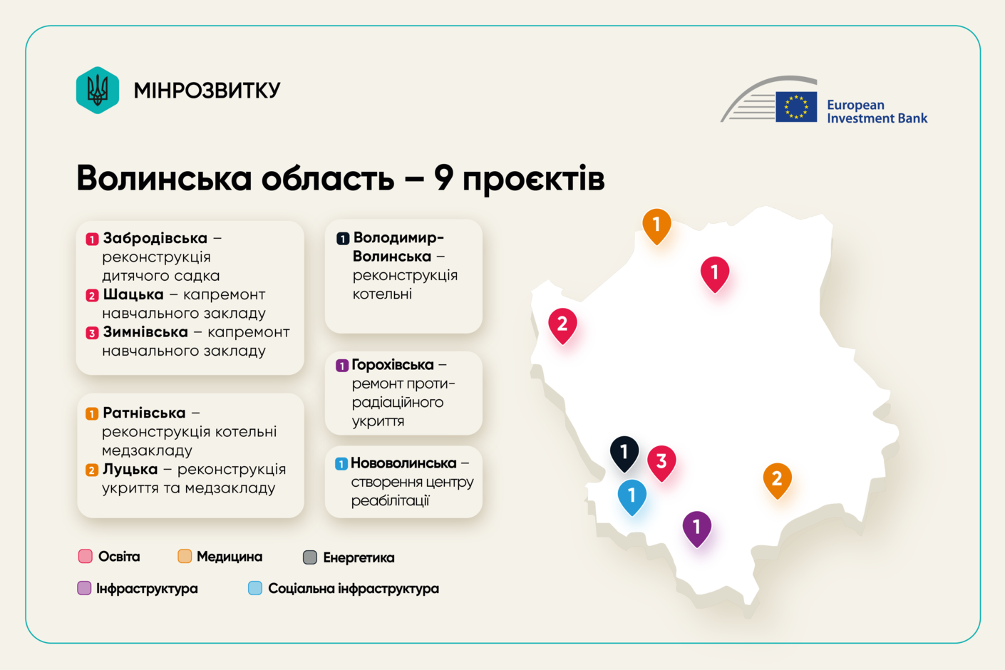 Раніше в межах програми вже рекомендовано до фінансування 5 обʼєктів Кіровоградської області, 11 проєктів Київської області, 6 - в Івано-франківській, 5 - у Черкаській, 7 проєктів - у Житомирській області, та 5 - у Вінницькій області.
