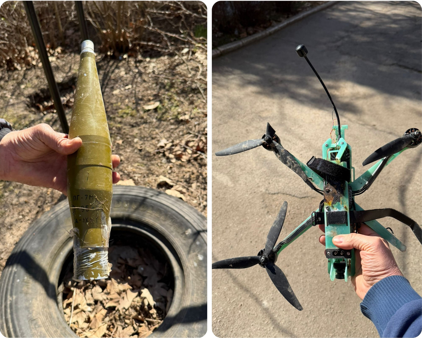 Російський снаряд, що був скинутий з дрону у Білозерці й не розірвався (фото зліва). Один з російських дронів-убивць (фото справа)