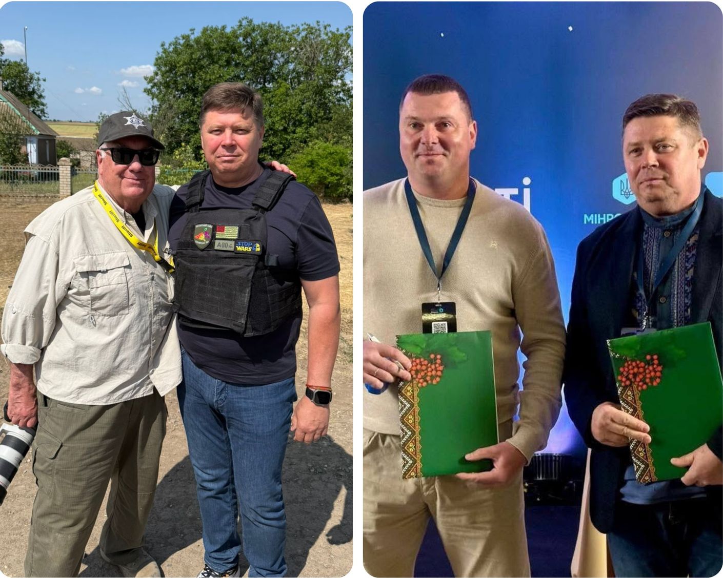 Американський бізнесмен, фермер і філантроп Говард Грем Баффет, син мільярдера Уоррена Баффета, й начальник Білозерської селищної військової адміністрації Херсонської області Ігор Острівний. Літо минулого року (фото зліва) Голова Феодосіївської громади, партнера Білозерської громади за проєктом «Пліч-о-Пліч», Володимир Цикаленко (ліворуч) та Ігор Острівний (фото справа)
