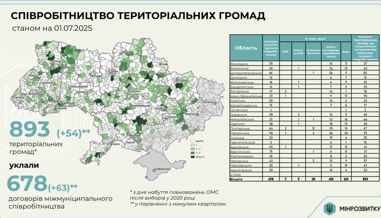 Станом на 1 липня 2025 року в Україні укладено 678 договорів співробітництва територіальних громад — це на 63 більше, ніж у попередньому кварталі. До цього процесу вже долучилися 893 територіальні громади, що також демонструє стабільне зростання (+54).