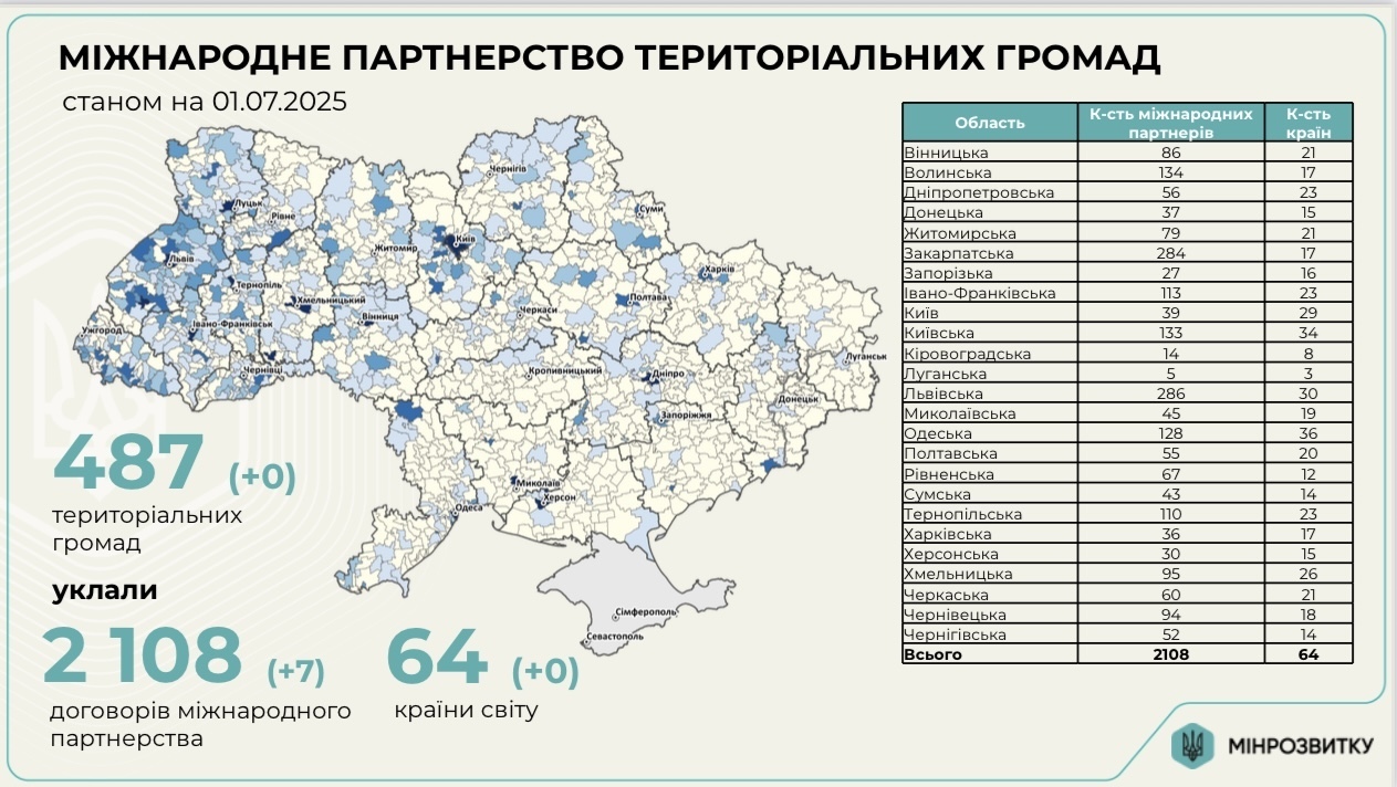 Станом на 1 липня 2025 року укладено 2108 чинних договорів міжнародного партнерства — на 7 більше, ніж у попередньому кварталі. У співпраці беруть участь 487 територіальних громад, які вибудовують зв’язки з громадами у 64 країнах світу.