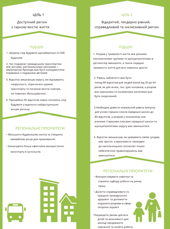 Для кожної цілі, яка, як і візія в цілому, орієнтована на горизонт 2050 року, визначені підцілі (вимірювані) з орієнтацію на горизонт досягнення до 2030 року, і пріоритети (сфери, завдання), на які регіональний розвиток має бути сфокусований в період 2018–2026 – восьмирічний період, на який план розрахований (два виборчі цикли).