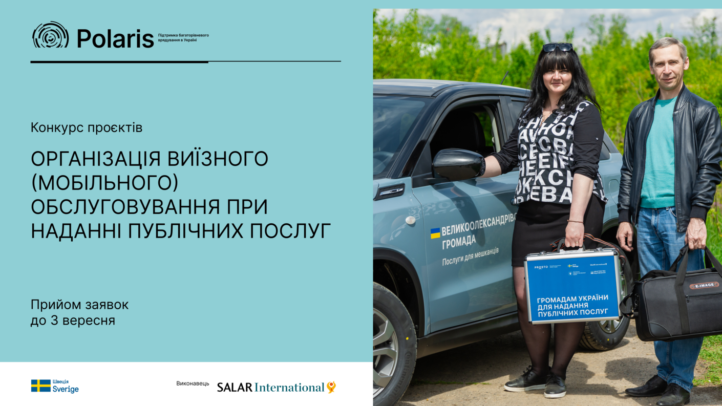 Шведсько-українська Програма Polaris «Підтримка багаторівневого врядування в Україні» оголошує конкурс на підтримку проєктів від громад щодо організації виїзного (мобільного) обслуговування при наданні публічних послуг. Конкурс проводиться в межах кризової підтримки Програми та спрямований на покращення доступності публічних послуг у громаді. Підтримані в межах конкурсу громади зможуть отримати експертно-менторський супровід щодо налагодження виїзного (мобільного) обслуговування та легковий автомобіль з мобільним кейсом. Планується відібрати до 10 громад.
