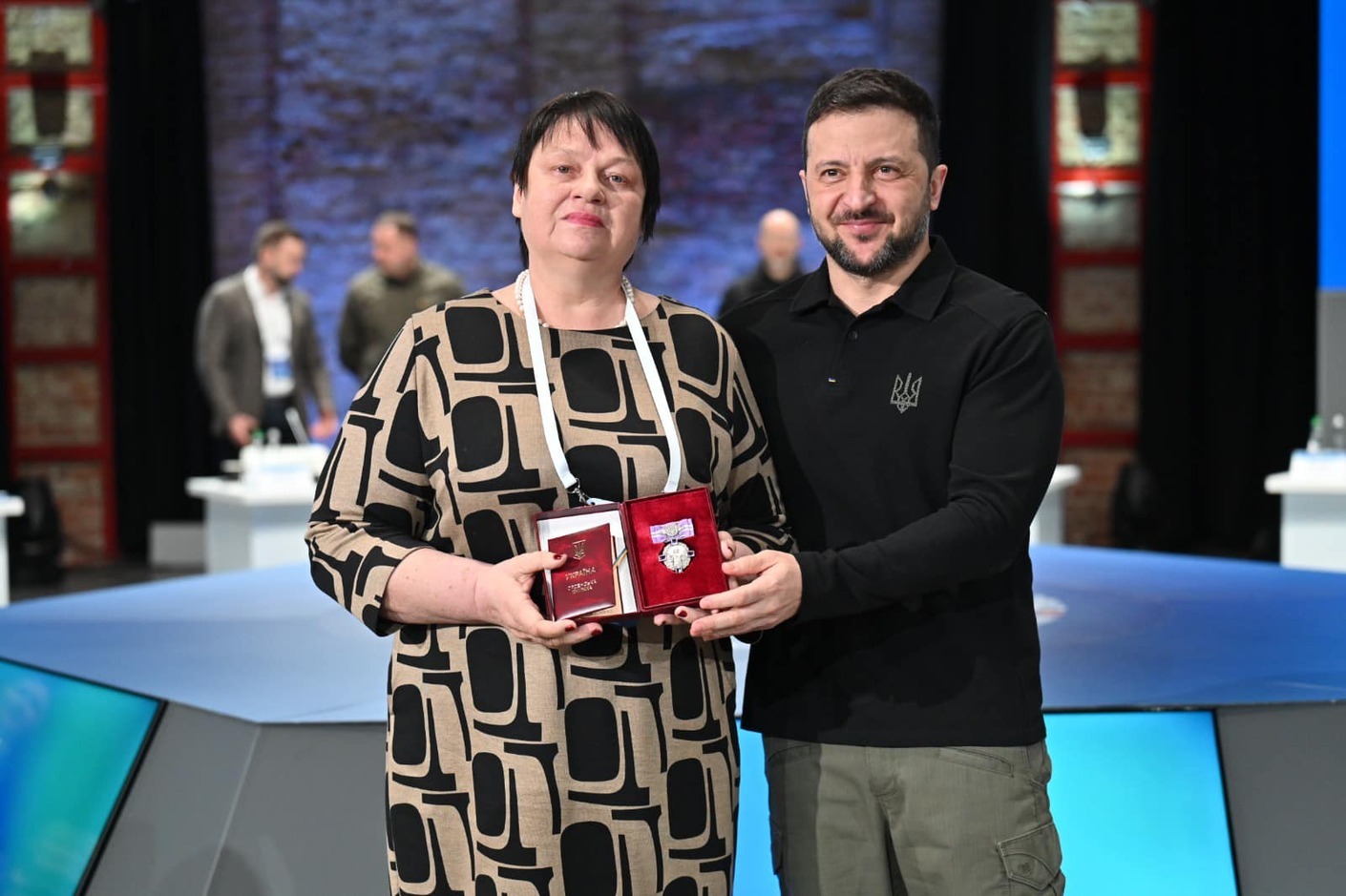 Командувач оперативно-тактичного угруповання «Суми», генерал-майор Олександр Нестеренко вручає Олені Сімі медаль «Почесна відзнака ОТУ «Суми» у вересні 2022 року