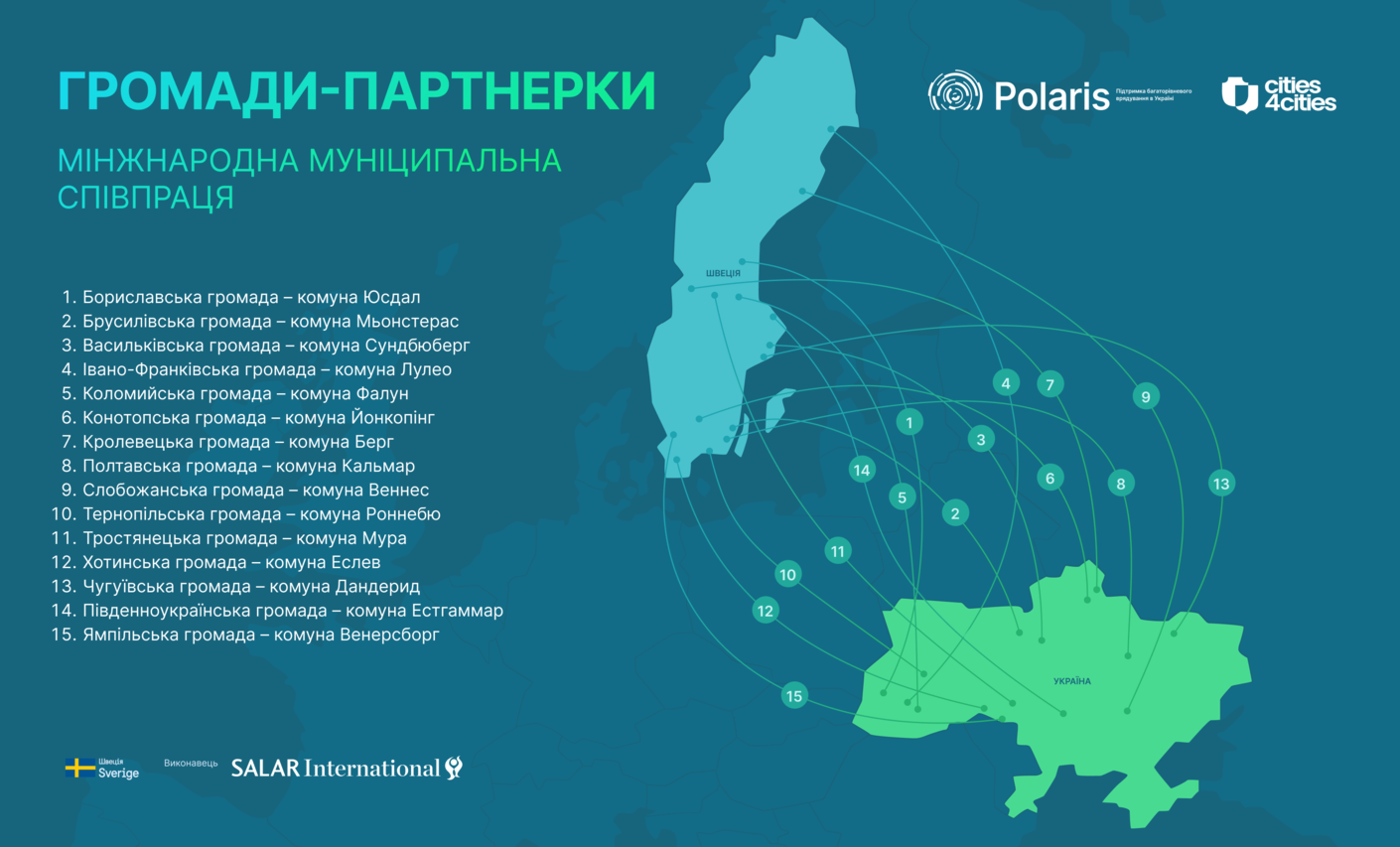 Програма Polaris «Підтримка багаторівневого врядування в Україні» визначила переможців конкурсу «Грантова підтримка шведсько-українських партнерств». П’ятнадцять громад отримають ресурси для спільних активностей з муніципалітетами Швеції на загальну суму 150 тис. євро. Реалізовує конкурс ініціатива Cities4Cities у межах напряму «Міжнародна муніципальна співпраця» Polaris.