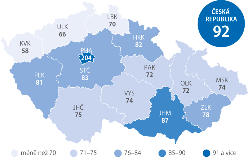 Малюнок 1. Рівень економічного розвитку регіонів Чехії у відсотках до середнього показника ВВП на душу населення  станом на 2019 рік. Джерело: https://statistikaamy.csu.gov.cz/rust-hdp-zpomalil-nejvice-v-praze