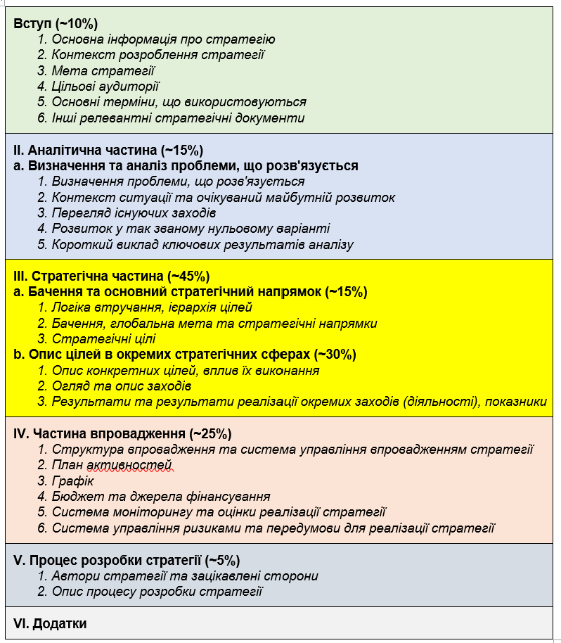 Ще один цікавий приклад – рекомендована структура стратегій, яка представлена в розділі шаблони (малюнок 3). Звернімо увагу, що вона  містить не тільки перелік основних розділів, але й рекомендації щодо того, яку частку від загального обсягу стратегії вони повинні займати.