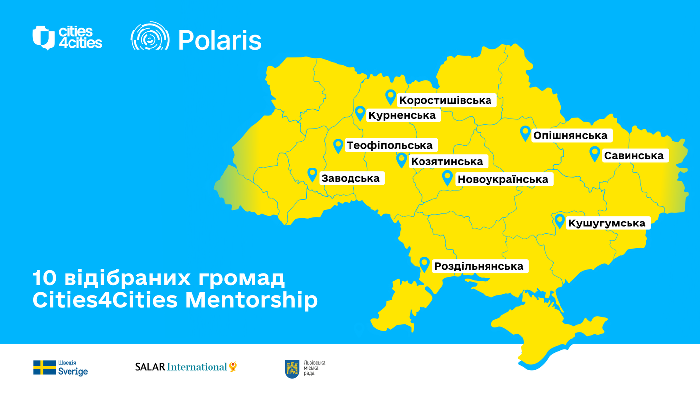 Cities4Cities, в межах Програми Polaris “Підтримка багаторівневого врядування в Україні”, оголошує результати конкурсу менторської підтримки громад. Протягом найближчих шести місяців десять команд працюватимуть із менторами та менторками над посиленням власної спроможності у сфері міжнародної співпраці.