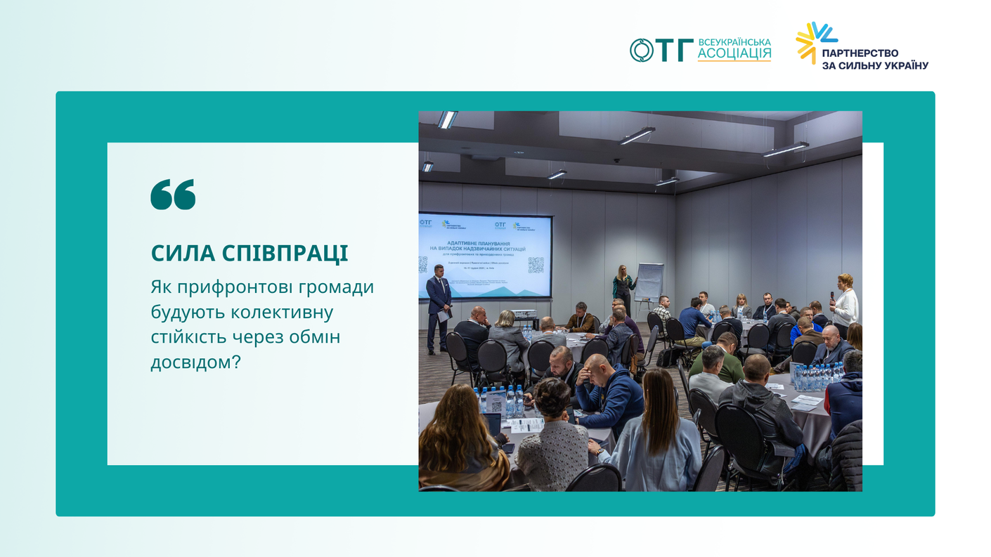 16-17 грудня у Києві представники 31 громади з семи областей зібралися у межах проєкту «Адаптивне планування на випадок надзвичайних ситуацій для прифронтових та прикордонних громад» (реалізує Всеукраїнська Асоціація ОТГ за підтримки Програми «Партнерство за сильну Україну»), щоб систематизувати досвід адаптації та стійкості, напрацьований в реальних умовах.
