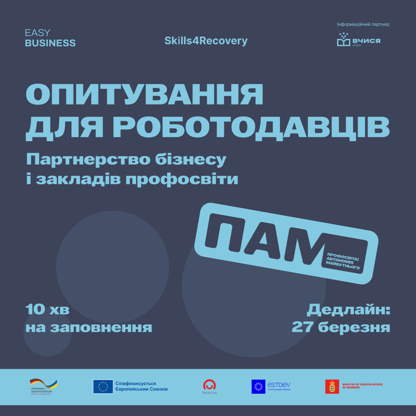 Проєкт «Автономія ЗПО та партнерства з бізнесом» реалізується EasyBusiness за фінансової підтримки Європейського Союзу, Німеччини, Польщі, Естонії та Данії у межах мультидонорської ініціативи Skills4Recovery, що впроваджується Deutsche Gesellschaft für Internationale Zusammenarbeit (GIZ) GmbH та Solidarity Fund PL (SFPL).