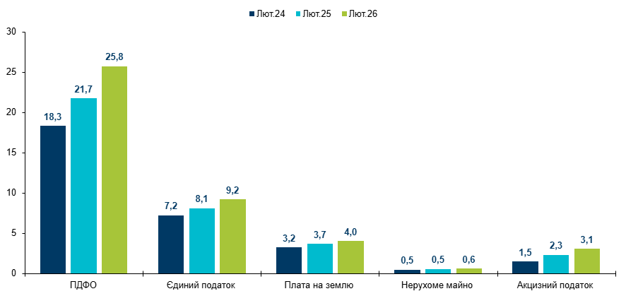 Рисунок 2. Надходження за основними податками до загального фонду місцевих бюджетів за лютий 2024-2026 років, млрд грн
