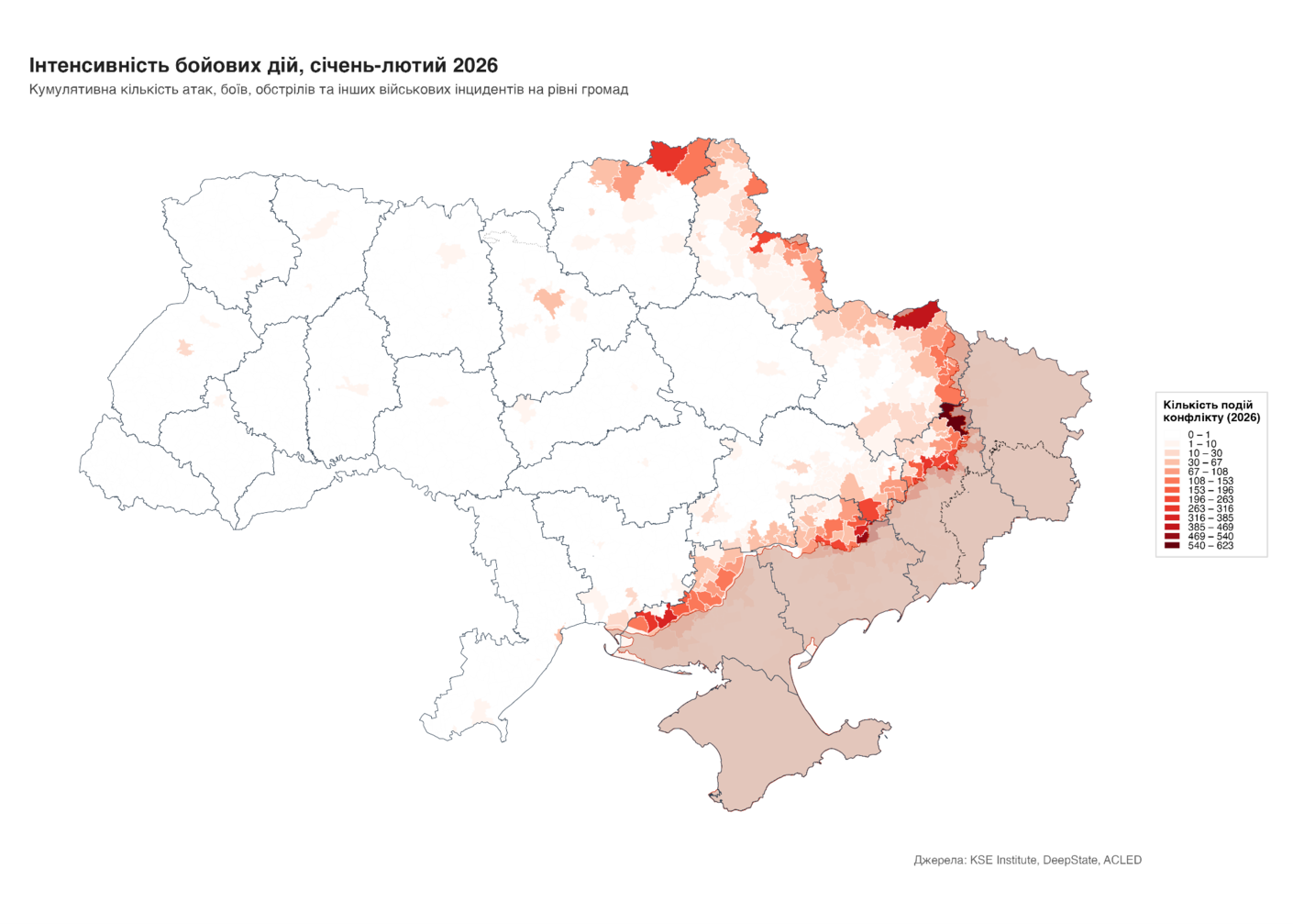 У громадах, підконтрольних Україні, в лютому 2026 року інтенсивність обстрілів (за даними ACLED, які наводять саме зафіксовані випадки повітряних обстрілів, а не збиті чи перехоплені цілі)  знизилася порівняно з січнем на 2%, але загальний рівень безпекового тиску залишався вкрай високим. Загалом за місяць зафіксовано 3659 епізодів ураження (2661 повітряна атака дронами або авіацією та 998 обстрілів, артилерійських і ракетних ударів).