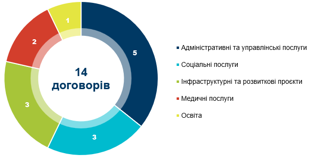 Соціальні послуги, як і інфраструктурні та розвиткові проєкти, охоплюють 3 з 14 договорів (21%). Зокрема, Арцизька міська громада Одеської області уклала з Авангардівською селищною громадою договір про реалізацію спільного проєкту «Разом сильніші», який передбачає координацію послуг водопостачання та вивезення твердих побутових відходів. Ще один розвитковий проєкт — «Разом до розвитку», укладений між Рівнянською та Ганнівською громадами Кіровоградської області, спрямований на культурні, освітні та туристичні ініціативи. Медичний напрям представлений договорами про спільне фінансування закладів охорони здоров’я, а освітній — угодою щодо організації викладання предмету «Захист України».