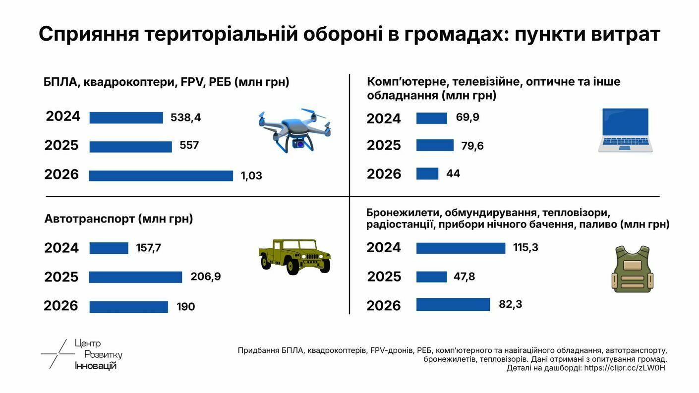 Найбільше коштів у минулому 2025 році громади спрямували на придбання БПЛА, квадрокоптерів, FPV-дронів, РЕБів та автотранспорту. На це 223 громади витратили 6,8 млрд грн, трохи більше 10% від загального бюджету громад. У планах на 2026 рік скорочення видатків до 3,9 млрд грн. Про це свідчать дані, які отримали аналітики, опитавши органи місцевого самоврядування.