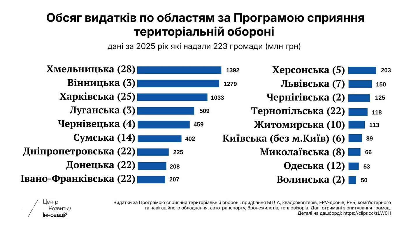 За Програмою сприяння територіальній обороні найбільше коштів спрямували громади у Хмельницькій, Вінницькій, Харківській, Луганській та Чернівецькій областях.