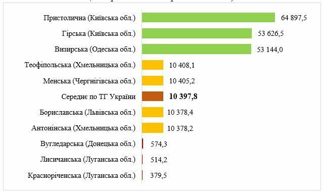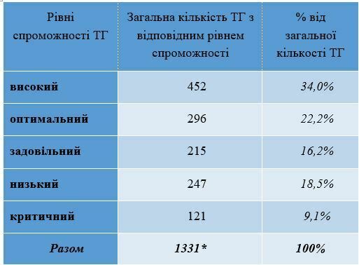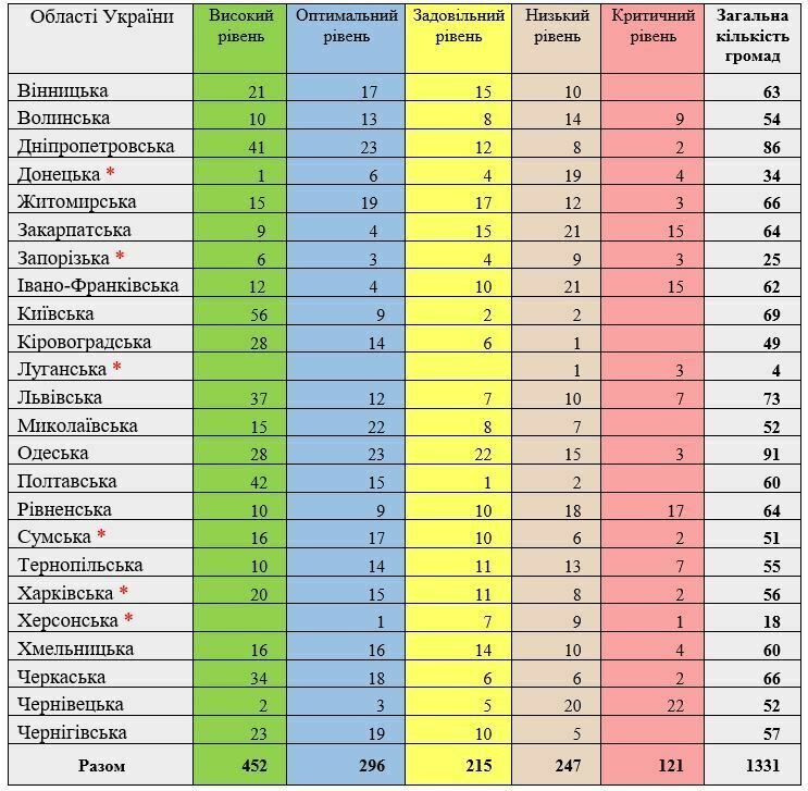 Із 452 територіальних громад, які включено до категорії високого рівня спроможності, найбільша кількість розташована на території Київської області – 56, у Полтавській – 42, Дніпропетровській – 41. Оптимальний рівень охоплює 296 територіальних громад, з яких найбільша кількість у Дніпропетровській та Одеській областях – по 23 у кожній, Миколаївській – 22, Житомирській та Чернігівській – по 19 громад. До задовільного рівня віднесено 215 територіальних громад, у тому числі: в Одеській області – 22, Житомирській – 17, у Вінницькій та Закарпатській областях – по 15 у кожній. До категорії з низьким рівнем належить 247 територіальних громад, серед яких у Закарпатській та Івано-Франківській областях – по 21 громаді, Чернівецькій – 20, Донецькій – 19. До категорії з критичним рівнем фінансової спроможності віднесено 121 тергромаду, з яких у Чернівецькій області – 22 громади, у Рівненській – 17, Закарпатській та Івано-Франківській – по15 у кожній.