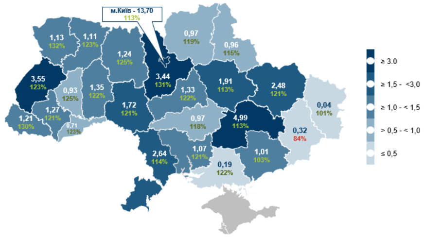 Фактичні надходження податку на нерухоме майно збільшились порівняно з березнем 2025 року на 16,6% до 0,6 млрд грн. Це зростання пов’язане з підвищенням мінімальної заробітної плати, яка станом на 1 січня 2025 року була на 12,7% вищою, ніж роком раніше (МЗП використовується для розрахунку податку для юридичних осіб).