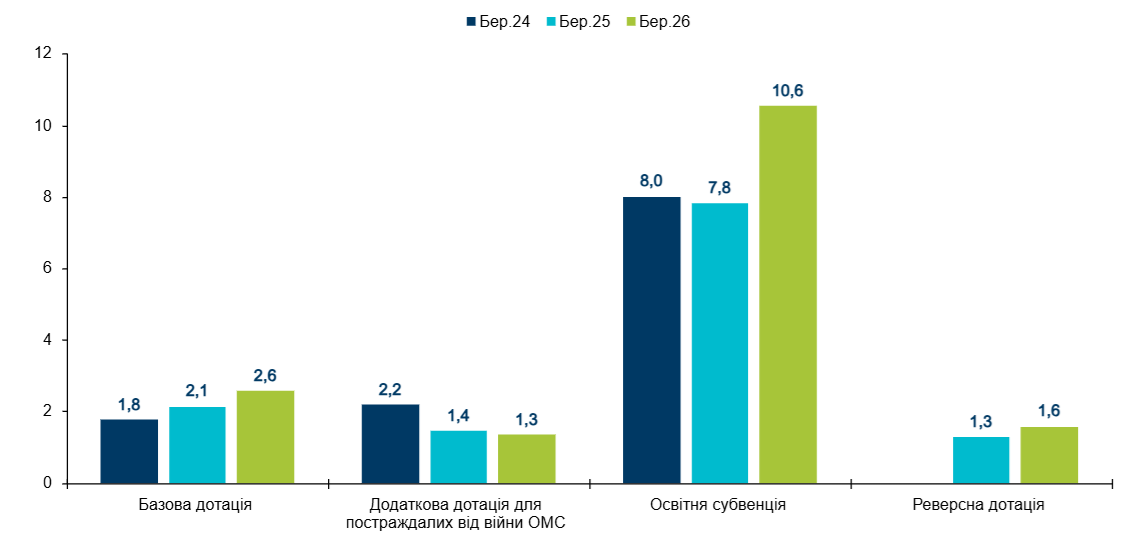 У березні 2026 року Уряд забезпечив перерахування міжбюджетних трансфертів місцевим бюджетам на 40,3% більше, ніж за березень 2025 року, зокрема базової дотації -- на 20,5%, освітньої субвенції -- на 35,2%. Зростання освітньої субвенції пов'язане з підвищенням заробітної плати педагогам з 1 січня 2026 року на 30%. Додаткової дотації для ОМС (17 обласних бюджетів, 945 бюджетів територіальних громад), що зазнали негативного впливу повномасштабної збройної агресії російської федерації, за березень 2026 року надійшло на 8,0% менше, ніж за березень 2025 року. Ця дотація має вирівняти фінансові диспропорції в місцевих бюджетах, забезпечити стабільні виплати зарплат у бюджетній сфері та компенсувати втрати доходів громад, спричинені російською агресією. Розподіл дотації здійснюється щоквартально на основі фактичних втрат доходів (ПДФО, податку на майно, єдиного податку).