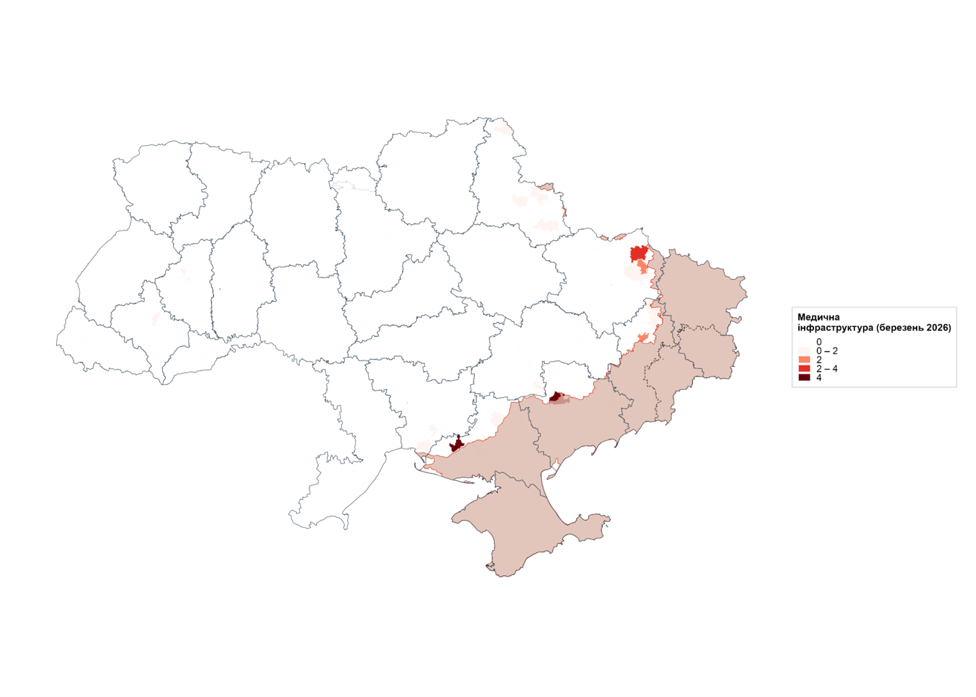 Ураження медичної інфраструктури збільшились з 22 об’єктів у лютому до 33 в березні.  Найбільше постраждали громади Херсонської та Харківської області (по 7 випадків), а особливо Василівська громада Запорізької області та Херсонська громадапо 4 випадки в кожній.