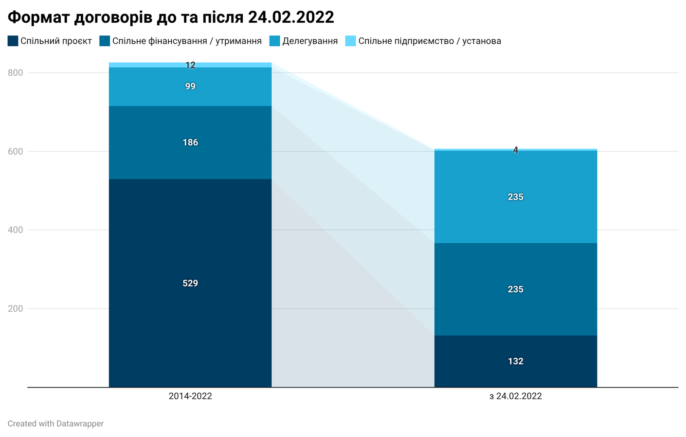 Після початку повномасштабного вторгнення міжмуніципальне співробітництво в Україні змістилося від реалізації окремих розвиткових проєктів до забезпечення базових послуг і передачі функцій. Якщо до 24 лютого 2022 року в реєстрі переважали угоди у формі спільних проєктів — 529 договорів, або 63,4% усіх нових реєстрацій того періоду, тоді як спільне фінансування та утримання становило 22,3%, а делегування завдань — лише 12%, то після початку великої війни структура стала майже дзеркально іншою. Із 606 угод, зареєстрованих після 24 лютого 2022 року станом на 30 березня 2026 року, 38,8% (235 договорів) припадає на спільне фінансування та утримання і на делегування завдань, тоді як частка спільних проєктів знизилася до 21,8% (132 угоди). Це означає, що співробітництво дедалі менше працює як інструмент окремих розвиткових ініціатив і дедалі більше — як практичний механізм фінансування послуг, передачі функцій та організації повсякденного життя громад в умовах війни. Виразною рисою березневих угод стала також активніша участь військових адміністрацій, які фігурують майже в половині нових договорів.