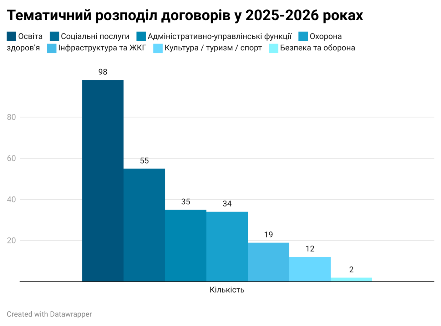 Останні реєстрації підтверджують, що громади використовують співробітництво насамперед для вирішення прикладних управлінських і соціальних завдань. У 2025 році та в першому кварталі 2026 року структура нових угод уже стабільно тримається навколо двох головних форм: спільного фінансування та утримання — 40,6% (108 угод) і делегування завдань — 37,6% (100 угод), тоді як на спільні проєкти припадає лише 21,4% (57 угод). Спільне фінансування та утримання[2] передбачає довгострокове об’єднання ресурсів громад для підтримки вже існуючих об’єктів і покриття операційних витрат, тоді як реалізація спільних проєктів має тимчасовий, результат-орієнтований характер і спрямована на створення або модернізацію інфраструктури. Найбільше нових домовленостей у цей період стосувалися освіти, соціальних послуг, охорони здоров’я та адміністративно-управлінських функцій. Іншими словами, громади найчастіше співпрацюють тоді, коли потрібно не втратити доступ до послуги, утримати інституцію або організувати сервіс для людей в умовах переміщення, кадрового дефіциту чи безпекового тиску.