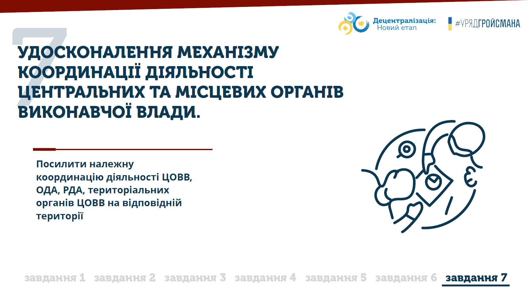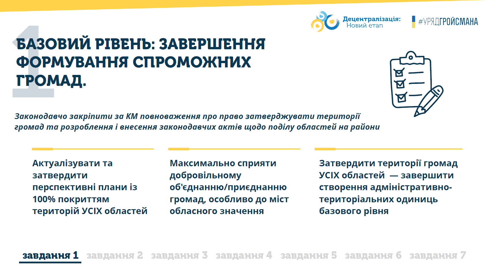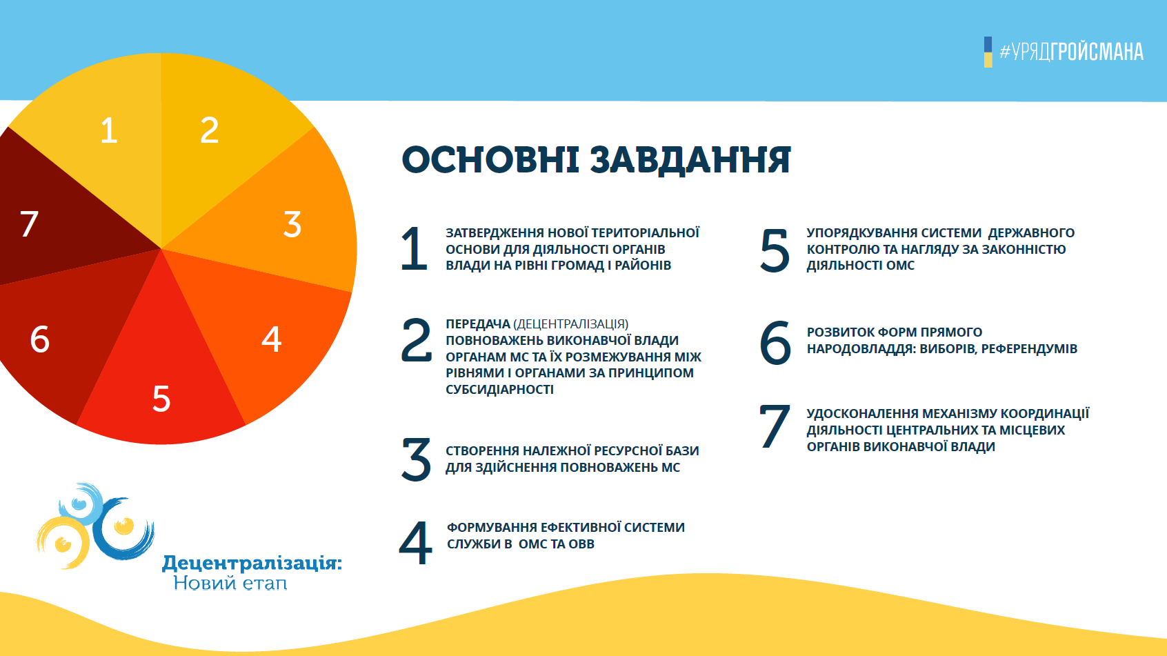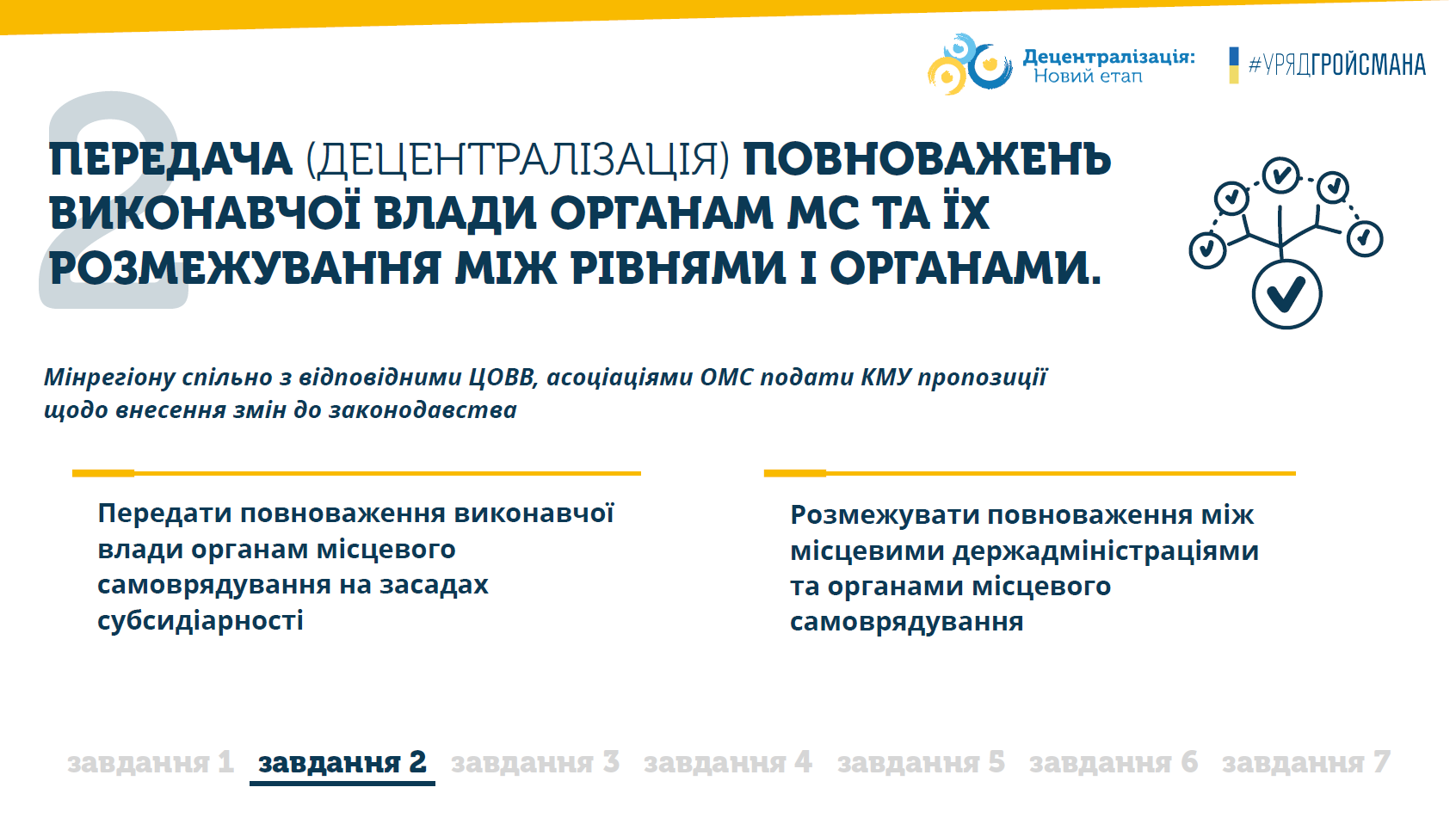 He explained that the new tasks include approval of the new territorial basis of the country – 100 capable rayons and 1600-1800 capable hromadas, consolidation of the financial self-sufficiency of local self-government, formation of an effective governance system, streamlining of the state control system, and avoidance of functions’ duplication.