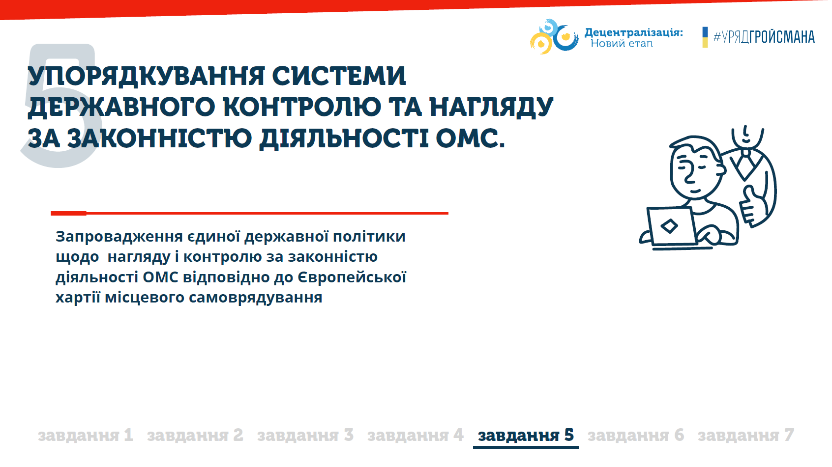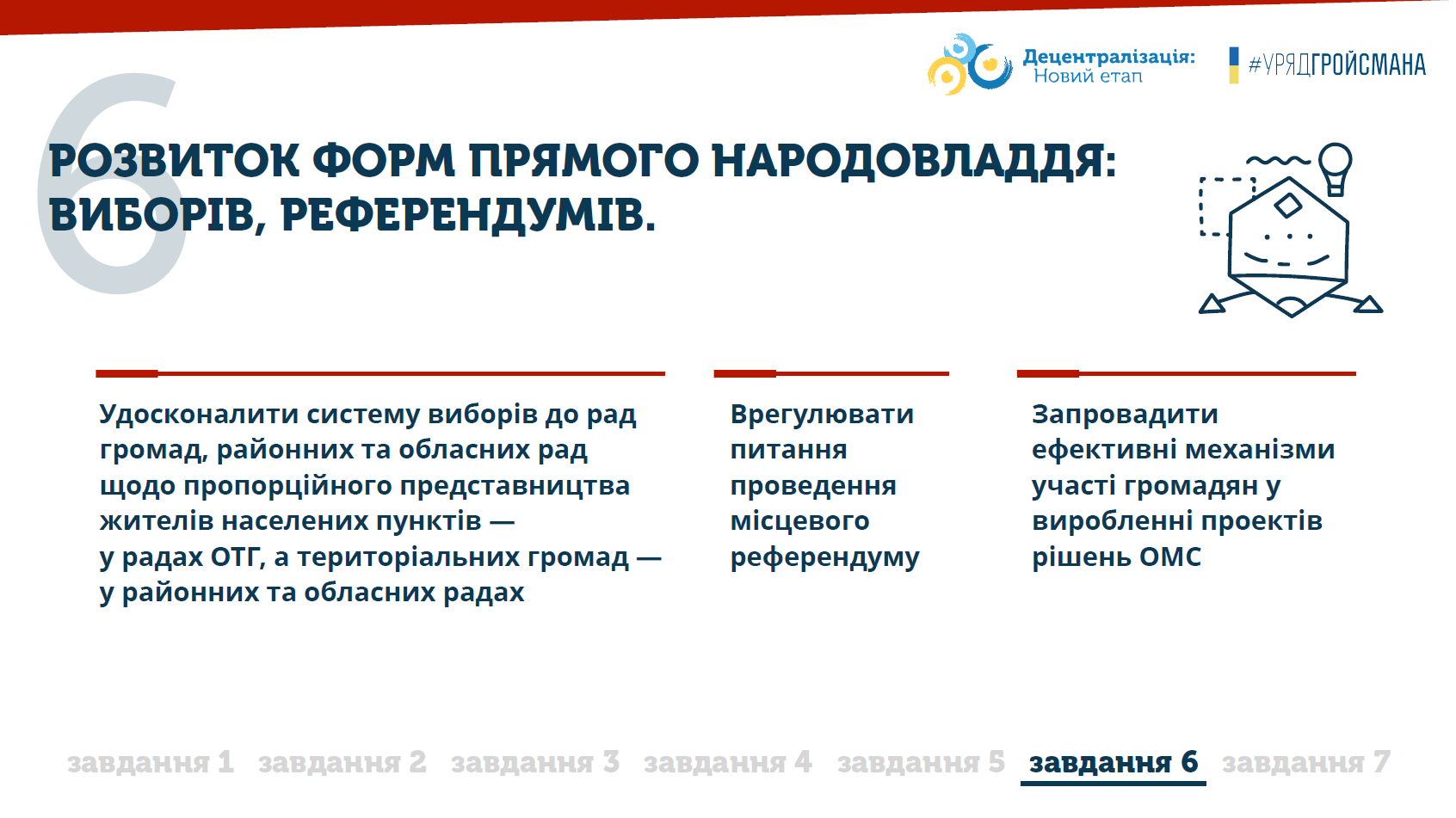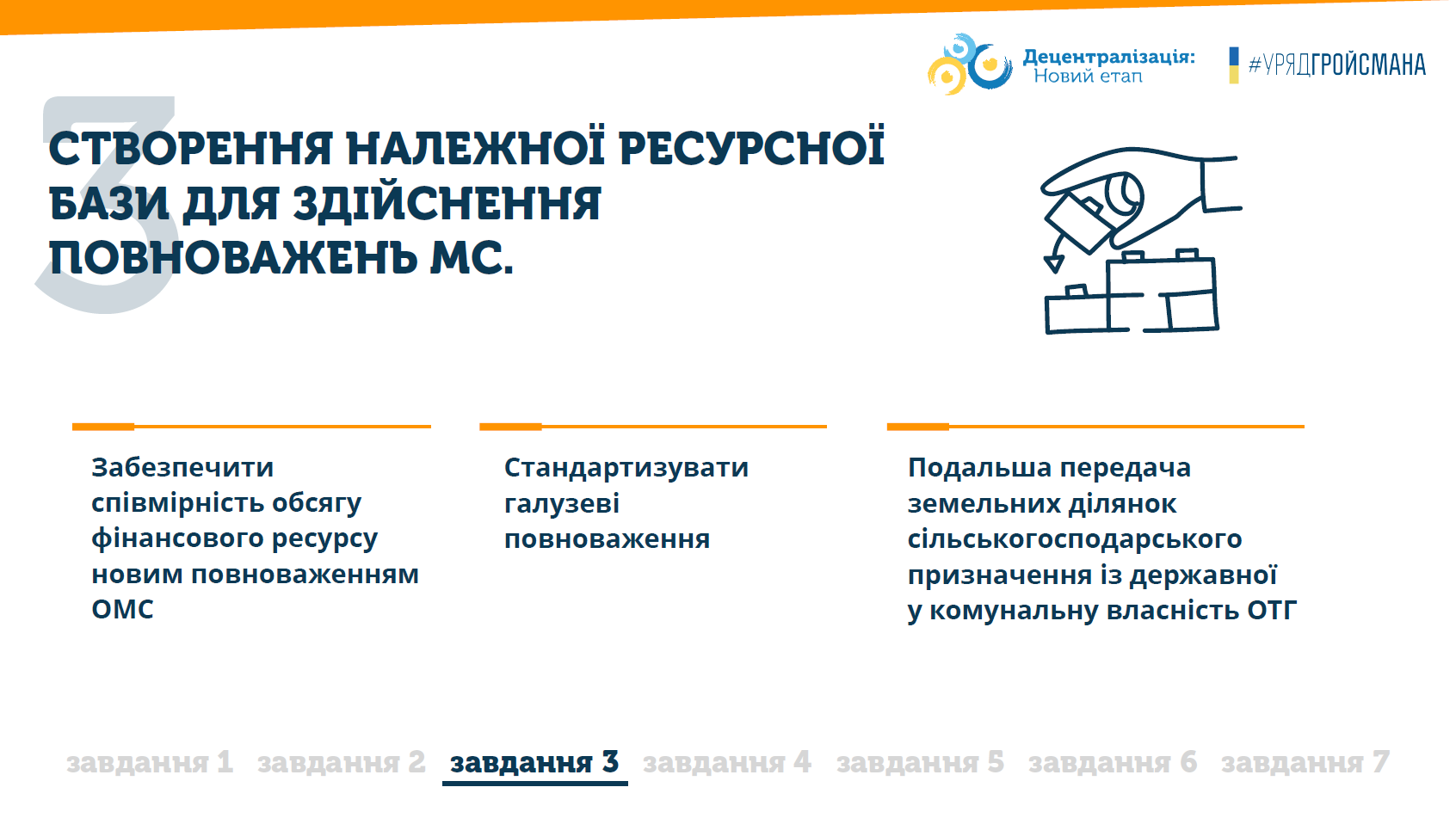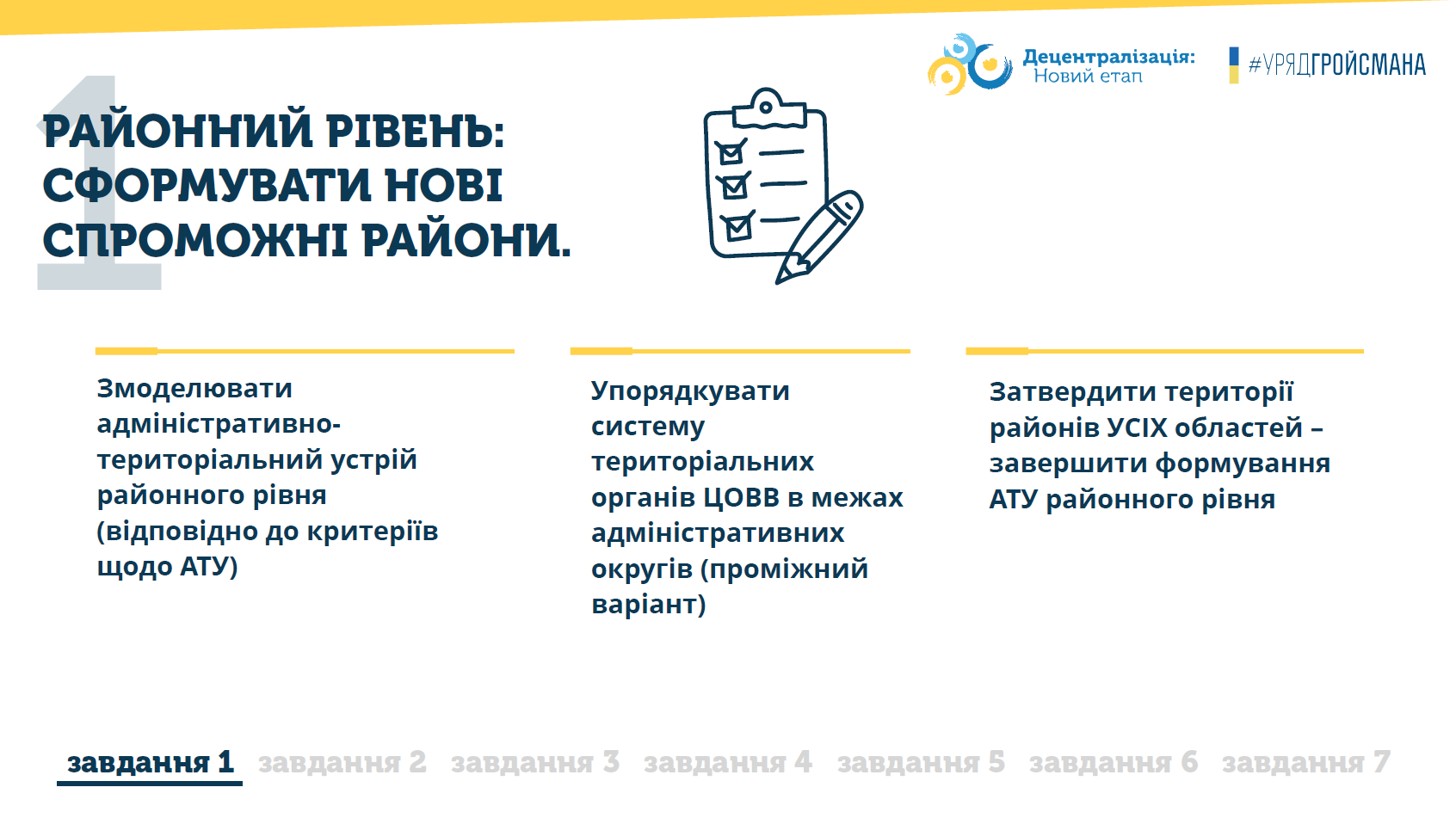 He explained that the new tasks include approval of the new territorial basis of the country – 100 capable rayons and 1600-1800 capable hromadas, consolidation of the financial self-sufficiency of local self-government, formation of an effective governance system, streamlining of the state control system, and avoidance of functions’ duplication.