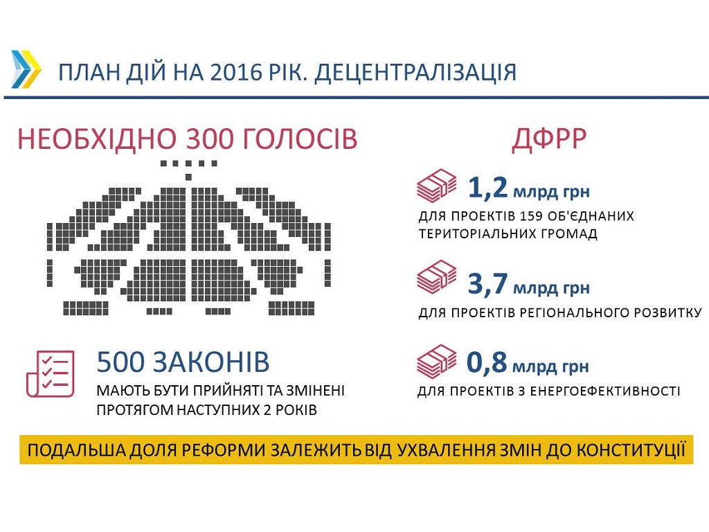 «2015 рік став безповоротною точкою у проведені децентралізації. У 2016 році ми повинні поставити стратегічну крапку в цій реформі і змінити близько 500 законів, які чітко розподілять повноваження між органами влади на всіх рівнях», - наголосив Геннадій Зубко.