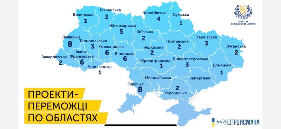 The project was launched last year. It is funded from the state budget and aimed at supporting new ideas in the culture area in small cities and amalgamated hromadas. A year ago, applicants submitted 167 initiatives, eight of which became the winners. This year, there are 182 applications participating in the contest, and 74 of them have been selected as the winners (LIST). The total funding for these cultural initiatives will be equal to UAH 41.3 million. The regions with the highest number of the winners are the Odesa and Lviv Oblasts – eight cultural projects will be implemented in each of these oblasts respectively. Th Vinnytsia, Khmelnytskyi and Ivano-Frankivsk Oblasts also belong to the top five regions demonstrating the highest engagement in the field of culture.