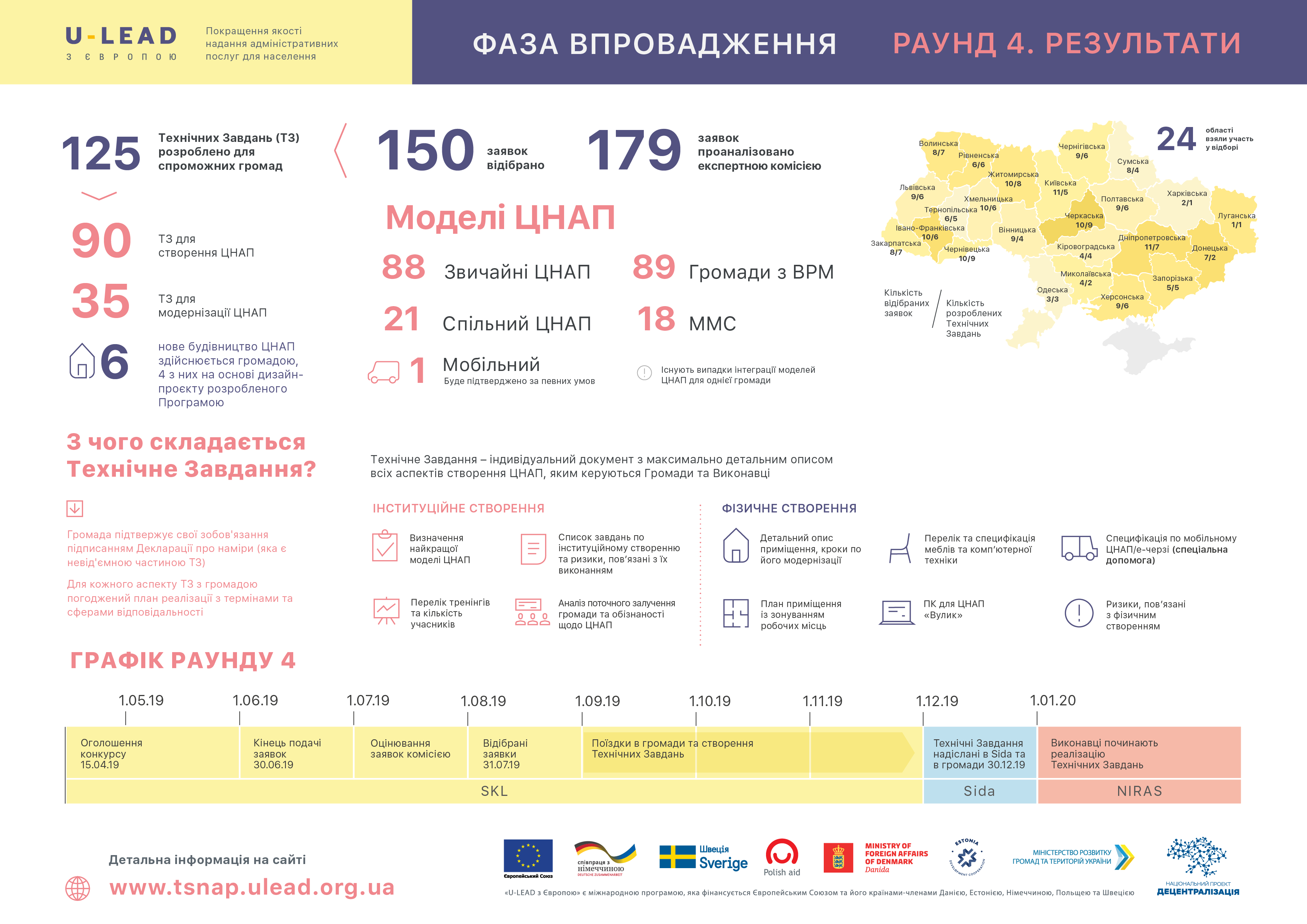 In April 2019, the team for improvement of quality of administrative services of U-LEAD with Europe Programme announced the fourth round for selection of hromadas for aid provision for modernization and establishment of ASCs. The selection commission which consisted of the experts of the Programme, representative of the Secretariat of the Cabinet of Ministers of Ukraine, MinRegion and the Ministry for Development of Economy, Trade and Agriculture of Ukraine, analysed 179 applications from 24 oblasts of Ukraine and selected 150 applications for further analysis of hromadas’ capability and development of technical requirement specifications for establishment or modernization of ASC.