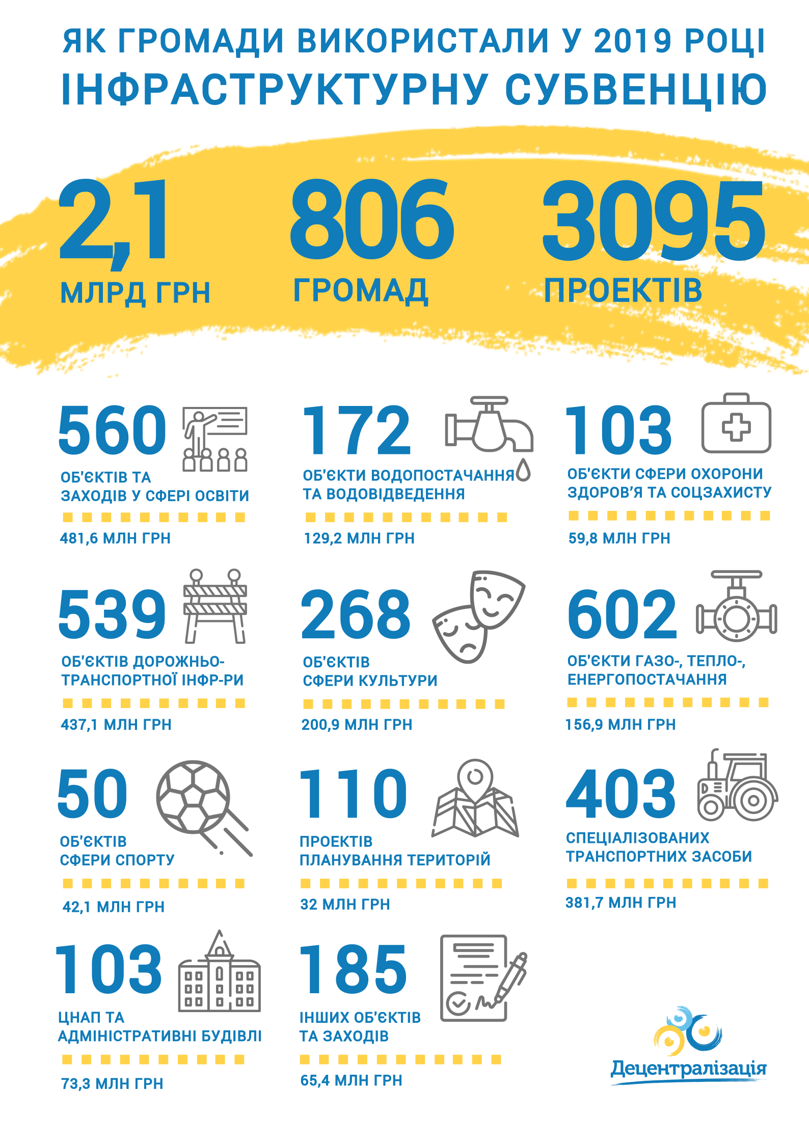 In 2019 amalgamated hromadas realized 3095 projects for the amount of 2,06 billion UAH funded with subvention aimed at the infrastructure development.