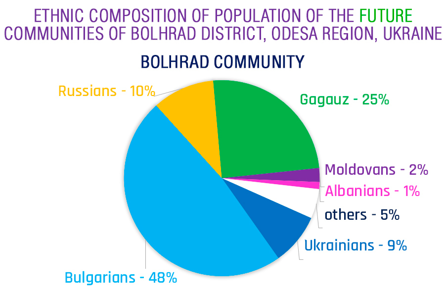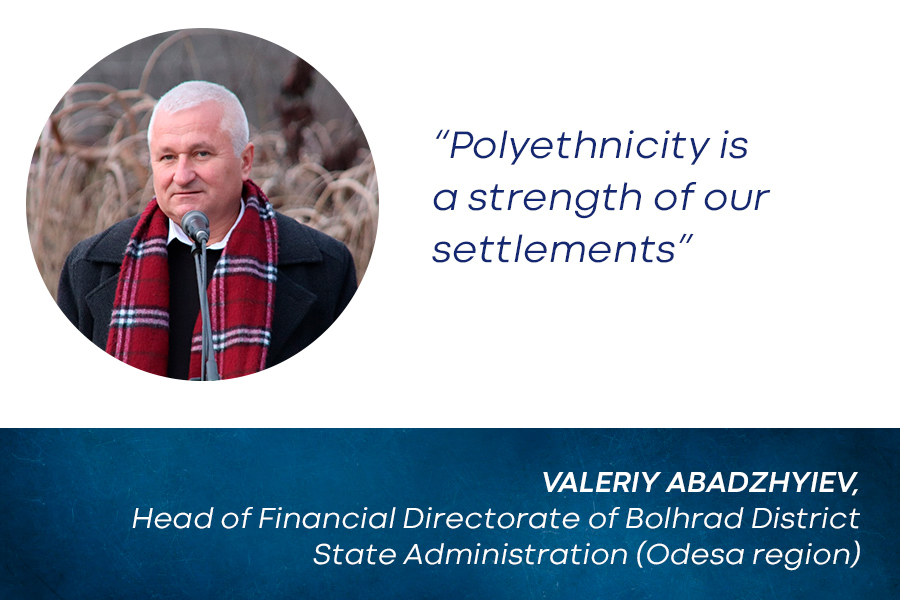 As reforms began in our district, future communities were identified based on economic criteria and accessibility of public services. However, there were attempts to slow down decentralisation process on the pretext of the ethnic composition of Bolhrad district’s residents. Of course, peace and harmony always were and will remain important for the locals… poly-ethnicity is a strength of our communities”. (Valeriy Abadzhyiev, Head of Financial Directorate of the Bolhrad District).