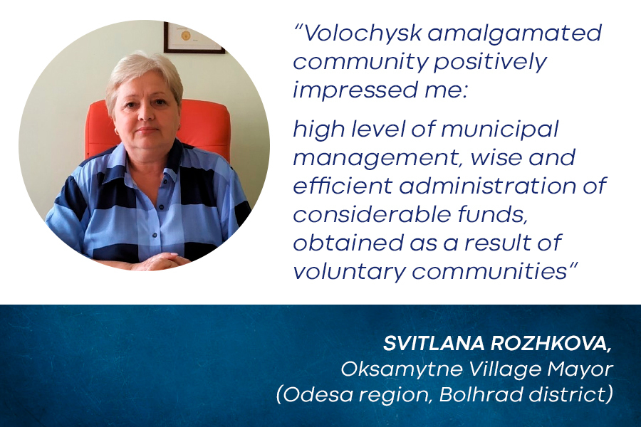 Svitlana Rozhkova, Oksamytne Village Mayor, participated in a study visit to Volochysk amalgamated community of Khmelnytsky region: “Volochysk community positively impressed me: high level of municipal management, wise and efficient administration of considerable funds, obtained as a result of voluntary amalgamation. They have cleaned up garbage in all their community and arranged the collection and recycling of plastic to be used for road construction. They have no disruptions in water supply anymore (and we still suffer from it) because they arranged water supply in a proper way and the service providers maintain relevant equipment in each village, in all 22 of them. They did not squander away money received from the state, but purchased modern, multifunctional equipment which would serve the community for many years. The community leaders were sincere and friendly; they eagerly shared their experience, in particular, in attracting investors, advised to hire professionals in specific areas… I only regret that we lost time and money, which could have been used to have the welfare of our residents improved by now”.