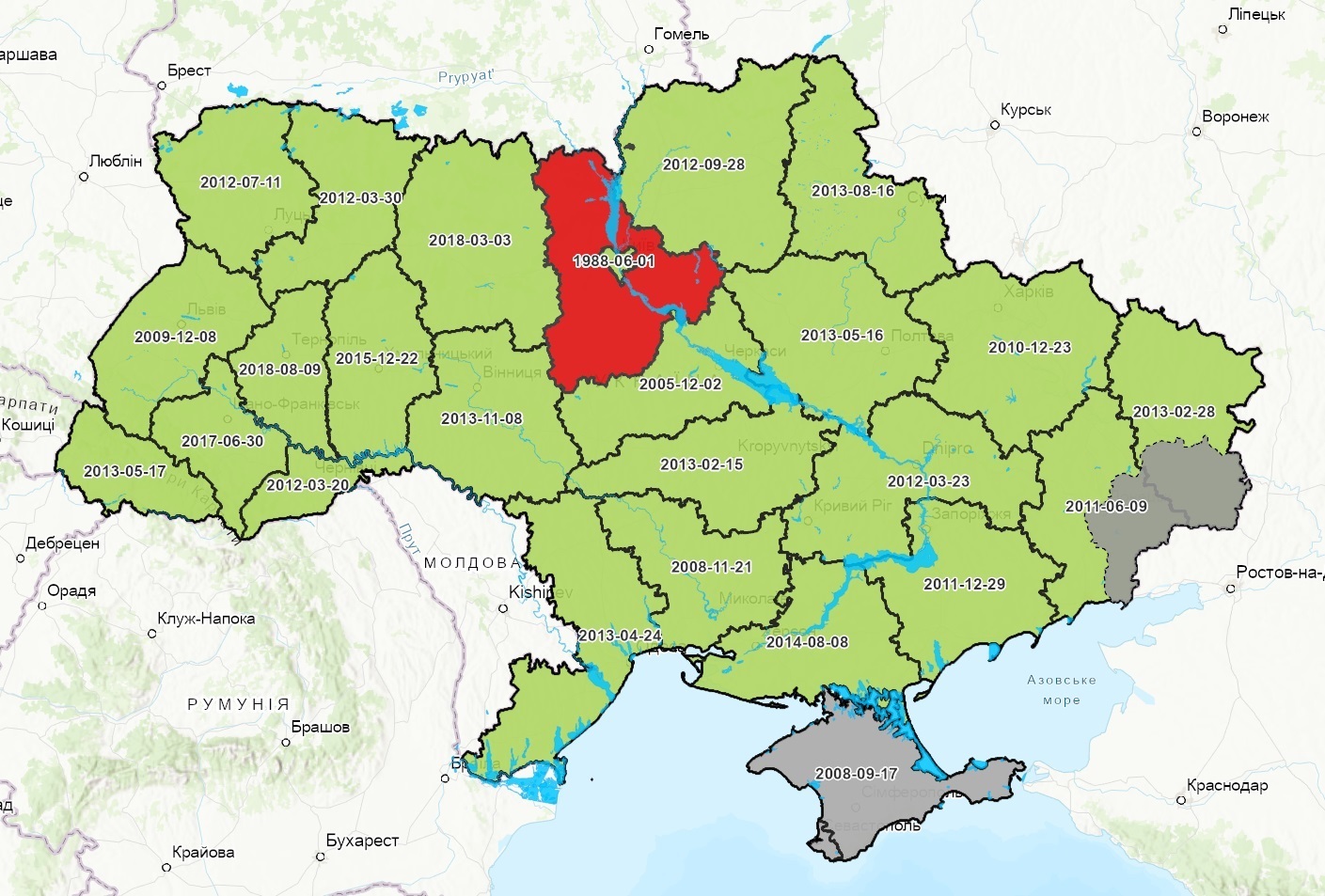Regional or oblast level (Figure 1. Regional level) is represented by Planning Schemes of Territory of Oblast. According to the data at PMAP resource all oblasts except Kyivska (documentation is dated by 1988) are provided with quite ‘fresh’ Planning Schemes, since most of them were adopted after 2010.