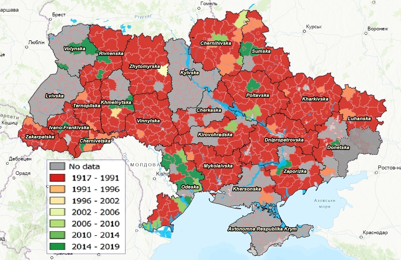 Let’s briefly check here, what the analysis has shown, but don’t hesitate to visit the web-map for more information and functionality! There you can find info on each represented administrative unit and even links to published documentation. Meanwhile, below are considered the four administrative levels – national, regional (oblasts), sub-regional (rayons), local (settlements and AHs).