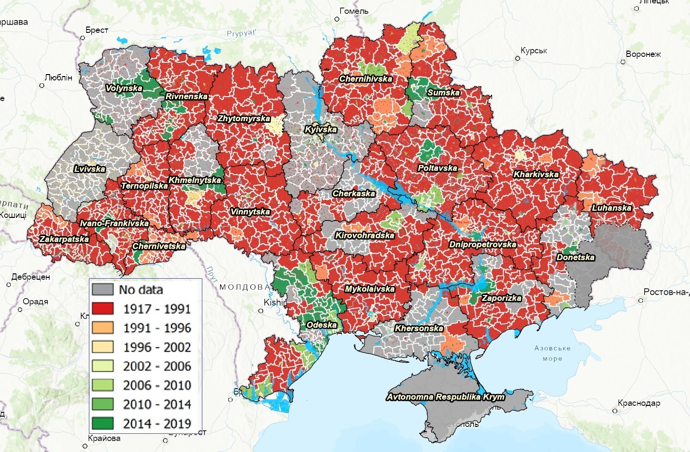Local level (Figure 3. Local level – Settlements (councils)) is represented by Master plans for settlements (cities, towns, settlements and villages). There is no exact information about 11605 (40%) settlements out of 29726, and 13900 (47%) settlements have master plans dated before 1992. For better visualisation of the data the figure reflects territory of local councils (10375) classified by date of approval of master plan of a main settlement, assuming that the situation with spatial planning documentation is rather similar for smaller and less developed settlements within a given council. There is a separate map depicting each settlement on the web-map.