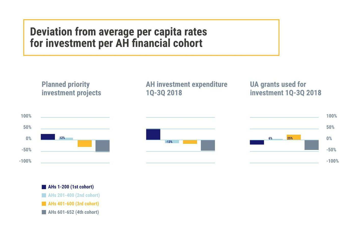 The chart here shows how much AH financial cohorts deviate from average per capita investment rates with regard to planned priority projects, investment spending, and grants received from higher levels of government (UA grants) for investment projects.[26]