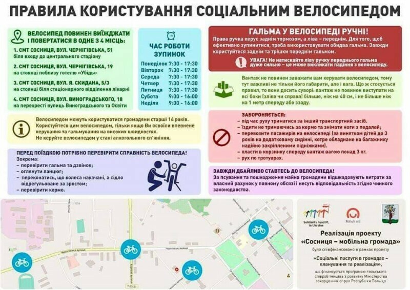 Систему спільного використання велосипедів, що дозволяє безкоштовно взяти двоколісний транспорт на одній з автоматизованих станцій, а після поїздки повернути велосипед у будь-який пункт прокату, запустили у Сосницькій територіальній громаді на початку квітня. Селищний голова Андрій Портний говорить, що проєкт надзвичайно важливий, адже це певний імідж їхньої громади: проєвропейської, екосвідомої, де розвивають велоінфраструктуру. І найголовніше – пропонують послугу громадського транспорту безоплатно, все засновано на довірі до людей.