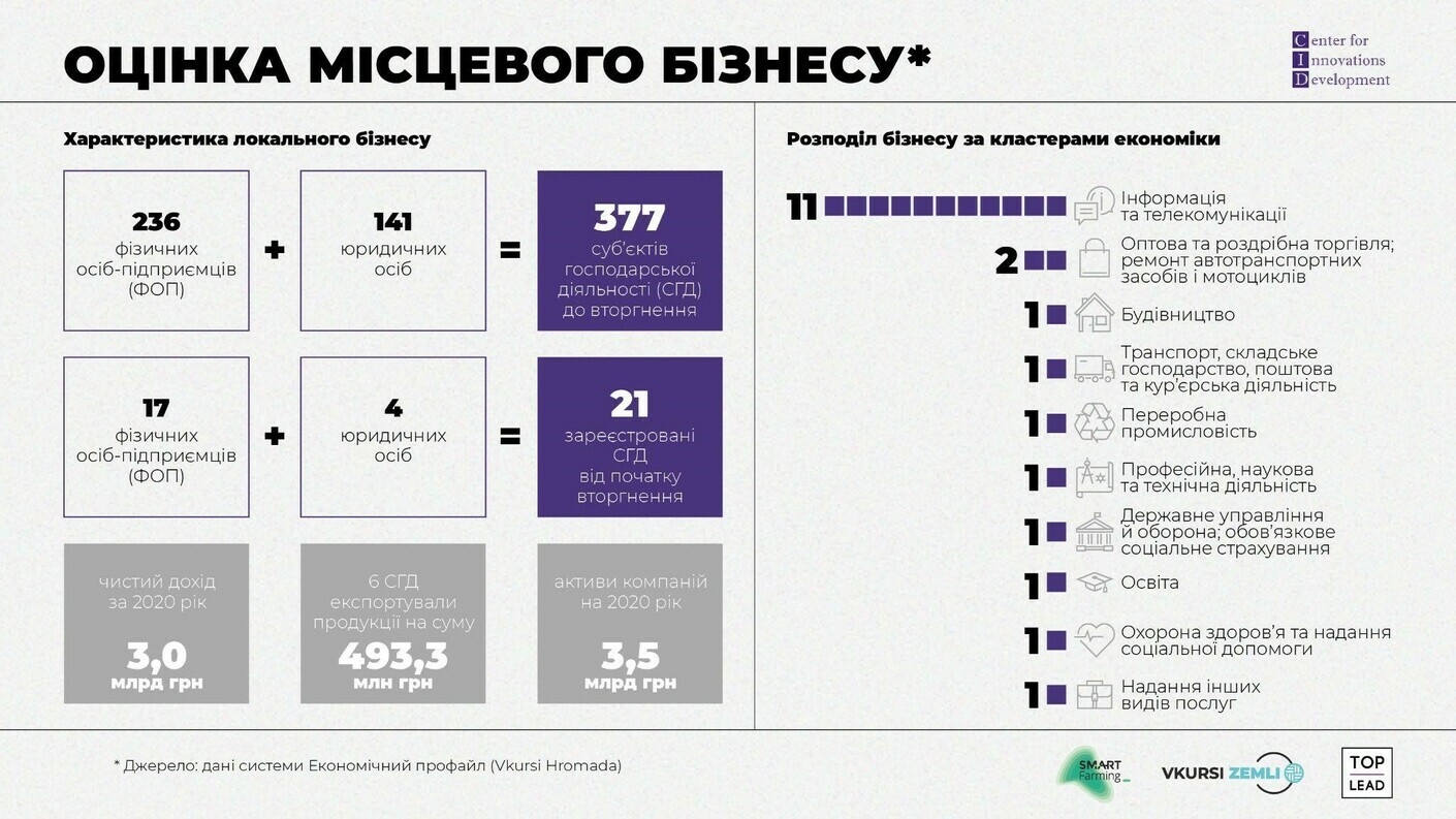 «Найбільше у Гостомелі було бізнесу, пов’язаного з інформацією та телекомунікаціями. На другому місті опинилася оптова та роздрібна торгівля, а також ремонт авто та мотоциклів. Далі – будівництво, транспортування та складські господарства, переробна промисловість, освіта, охорона здоров’я» – уточнює Михайло Лейченко, аналітик Центру розвитку інновацій, який досліджував домінуючий кластер бізнесу та економічний профайл громади в межах підготовки звіту з даними RebuildUA.