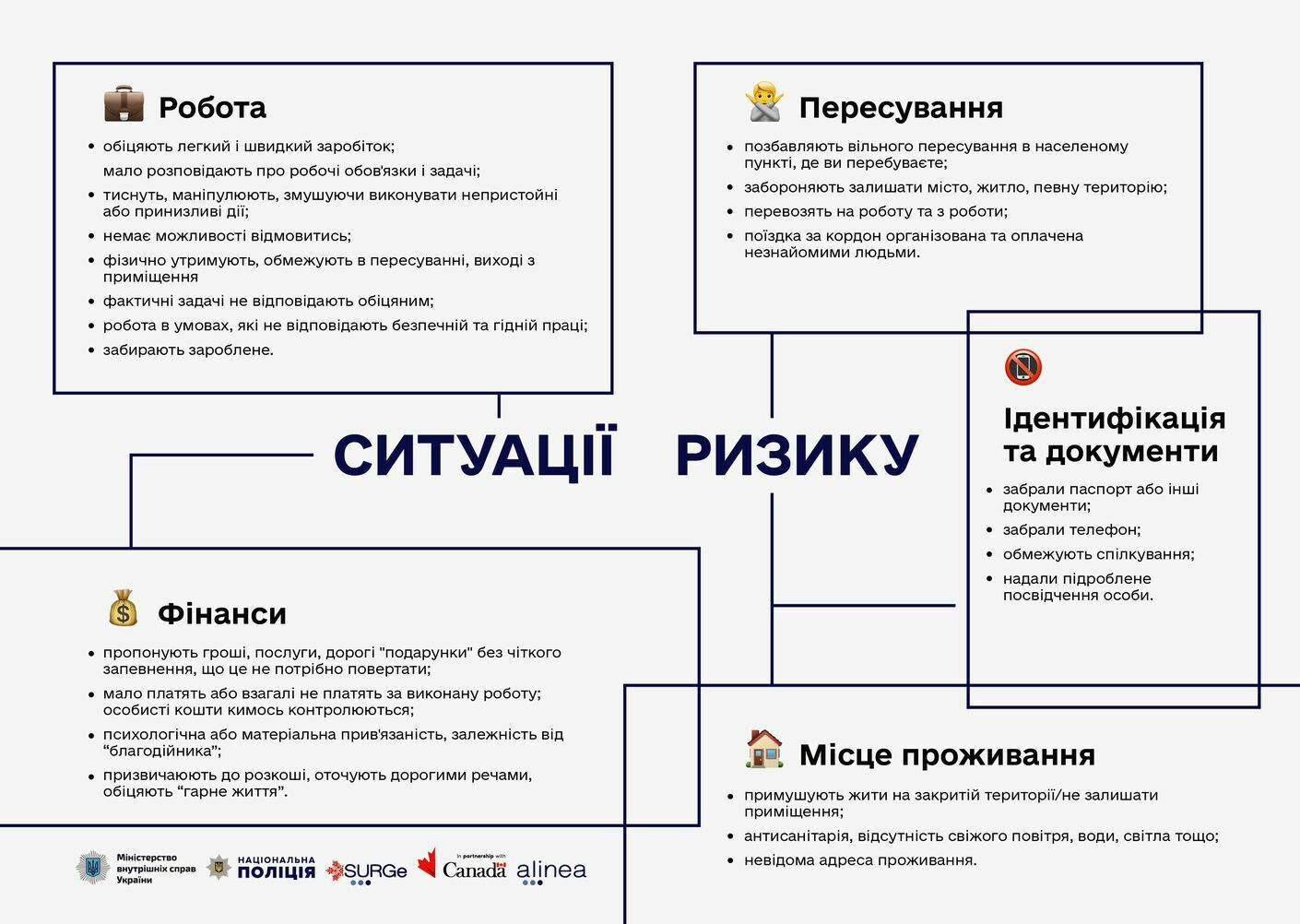 Досить часто люди не відчувають ризику потрапляння в ситуацію торгівлі людьми, не  розпізнають небезпечні сигнали. У цьому може допомогти наведений у графіці перелік ситуацій з ознаками ризику.