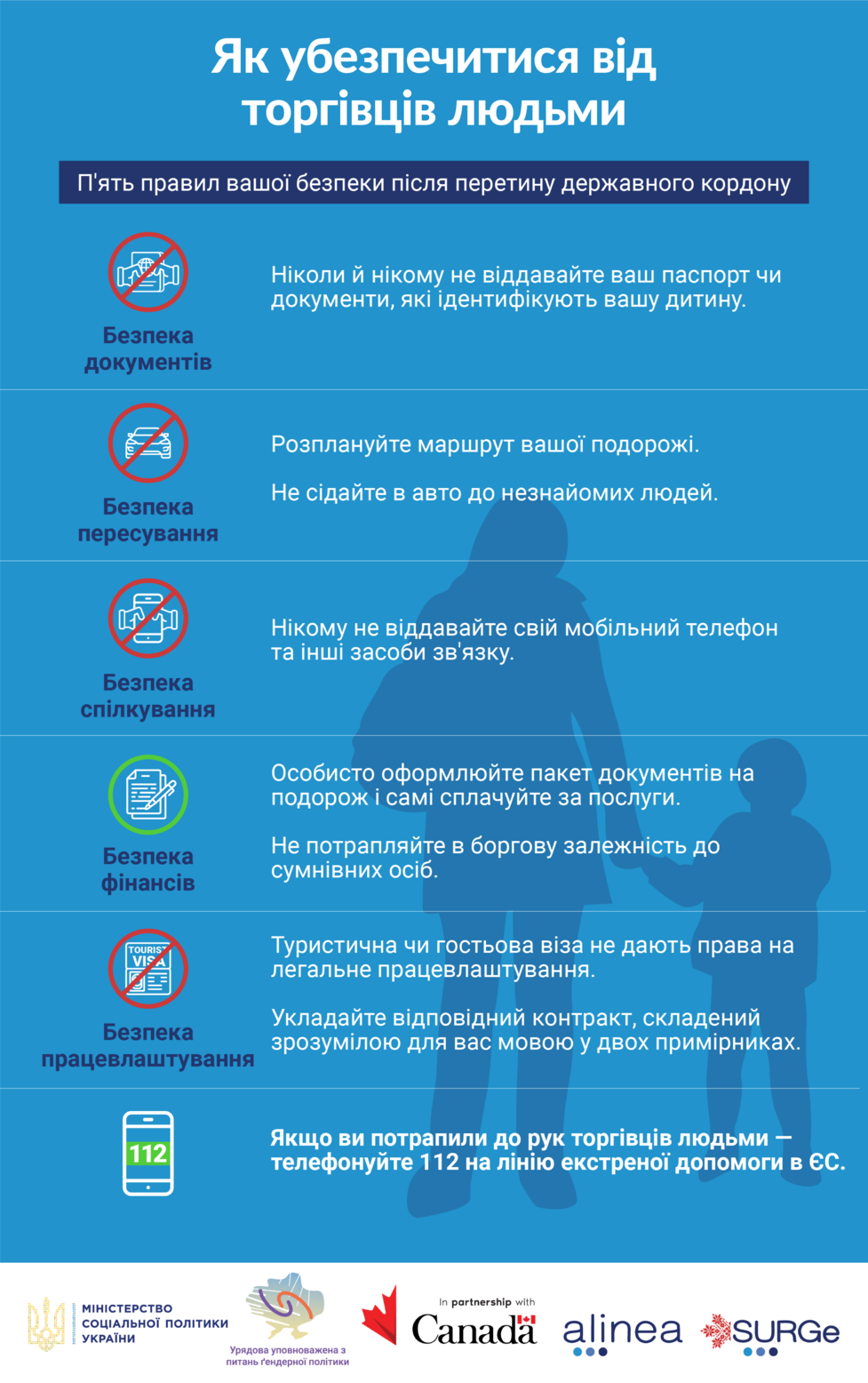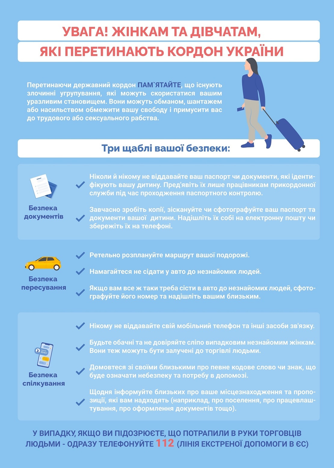 Аби применшити ризики потрапляння ними в ситуацію торгівлі людьми, щонайменше треба знати елементарні правила поведінки та їх дотримуватися. Такі правила перераховано у цій листівці. Інформаційні матеріали було створено для тих, хто виїздить за кордон - однак ці «ази» актуальні і для внутрішньо переміщених осіб.