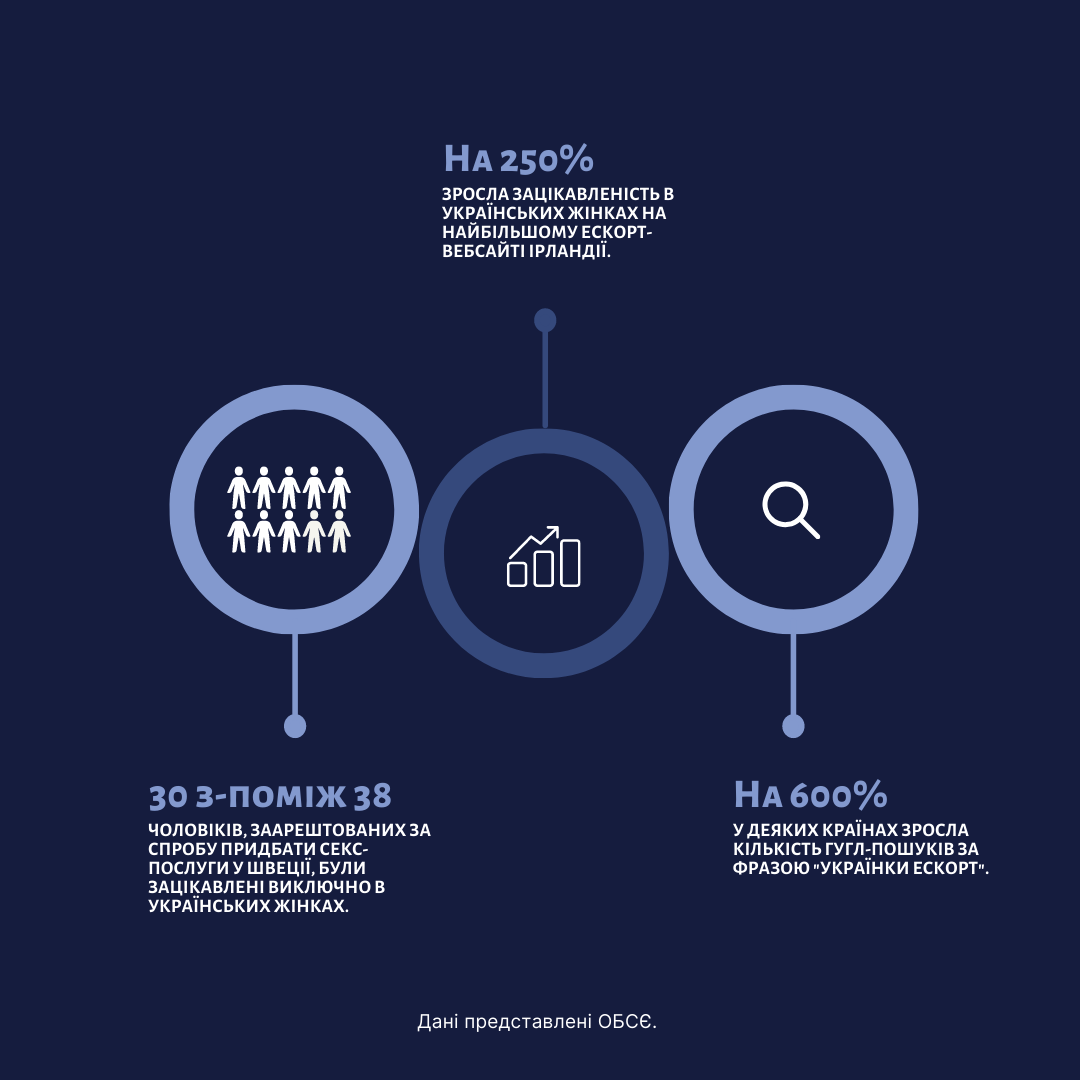 Дані Thomson Reuters свідчать, що після початку повномасштабної війни в Україні кількість принизливих пошукових термінів сексуального характеру, пов’язаних з українськими жінками,  зросла на 300%. За свідченнями Спеціального представника ОБСЄ з питань торгівлі людьми, попит на сексуальну експлуатацію українських жінок є стимулом для торговців людьми вербувати та масштабно експлуатувати українських біженок.