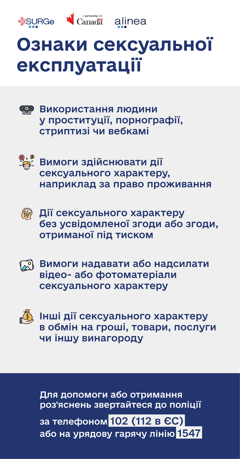 Тож щоб допомогти визначити ситуації, що можуть класифікуватися як сексуальна експлуатація, експерти проєкту SURGe підготували інфографіку. Важливо звертатися за домогою одразу, як тільки виникають підозри, що ситуація може мати ознаки такої експлуатації або бути небезпечною.